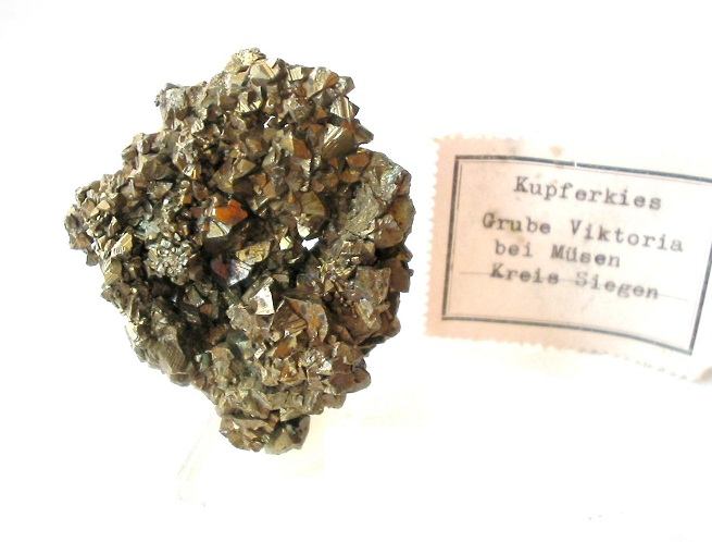 Ein Mineral, was etwas im Schatten der bekannteren Arten im Müsener Bezirk steht, ist der Chalkopyrit. Insbesondere die Grube Victoria hat sehr schöne Stücke geliefert. Abgebildet eine 5 cm hohe Stufe komplett aus xx aufgebaut.