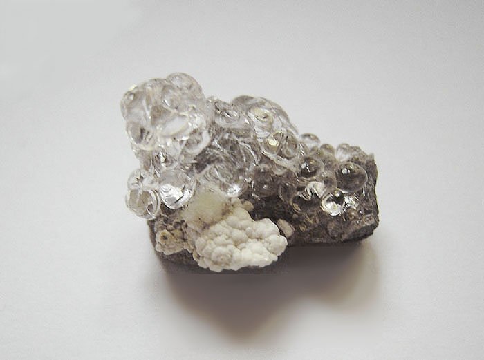 Staffelit (Carbonat-Fluorapatit) in Paragenese mit Hyalit (Glasopal) von Valec! Sehr preiswert erworbene, attraktive Kleinstufen vom 2. Mineralientag in Bettendorf!