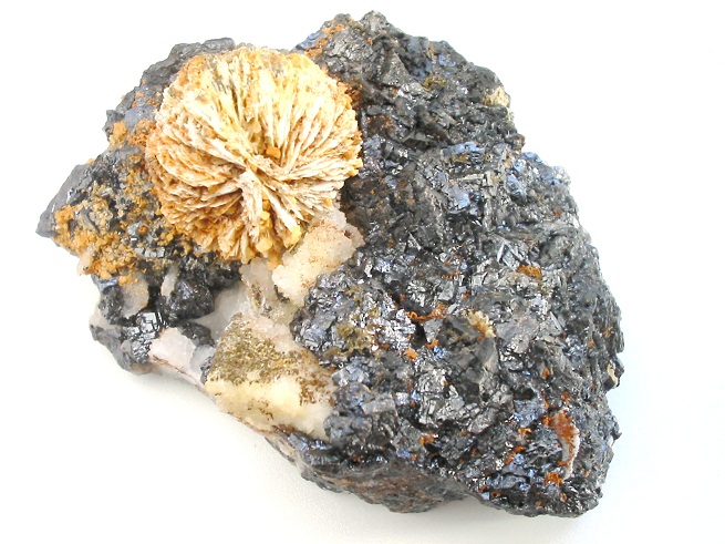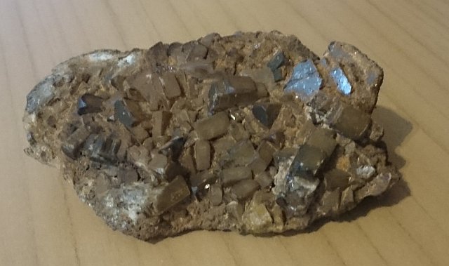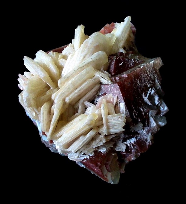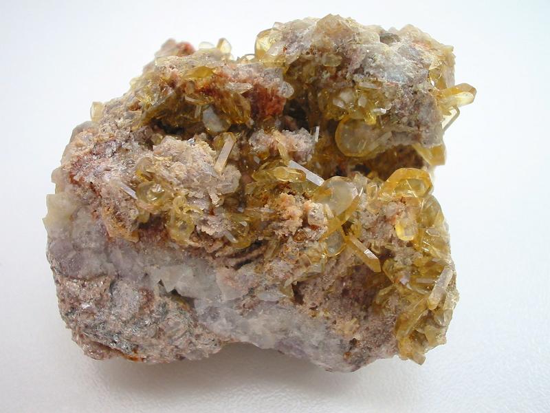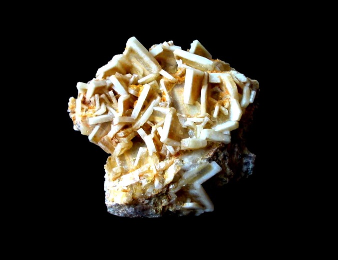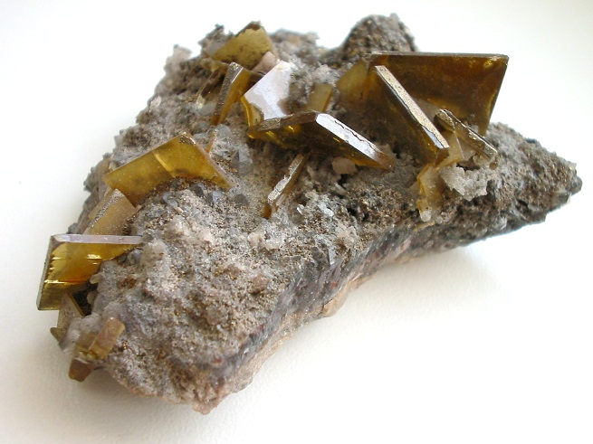 Zonare, typisch "goldene" Kristalle bis 3 cm Länge von der -120 m Sohle, Pöhla, Erzgebirge. |