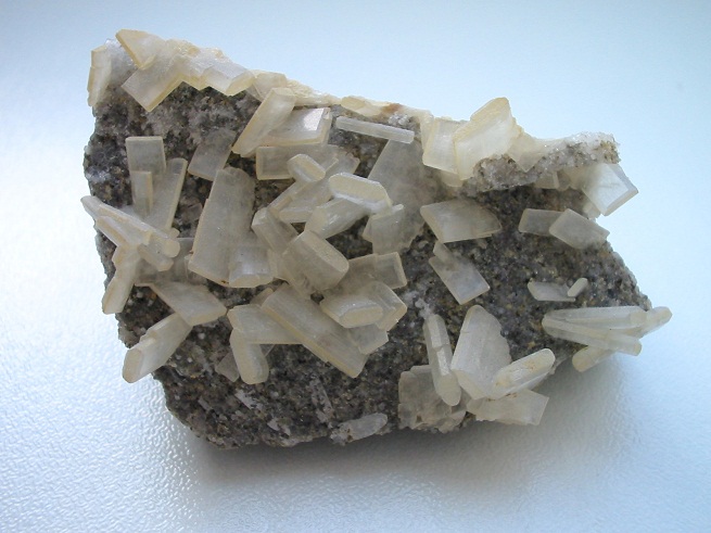 Ölgrüne Baryttafeln auf Dolomit von Oberschlema im Erzgebirge. Breite ca. 8 cm. |