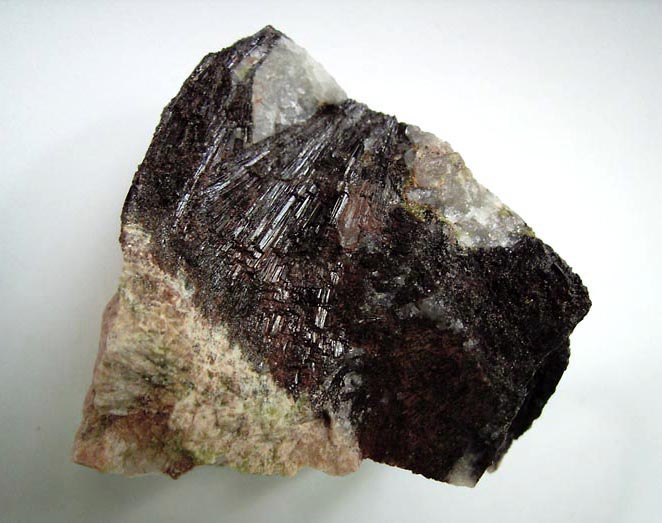 Das einzig positive für den hamsternden Systematiker: immer mehr neue Arten für die Sammlung. So dürfte das abgebildete Stück, einst als Augit erworben und nun mal genauer unter die Lupe genommen und als Turmalin identifiziert, ein Oxy-Schörl sein. Dafür spricht zumindest sein Fundort, der Saidenbach bei Sayda im Erzgebirge. Die xx messen bis 2 cm.