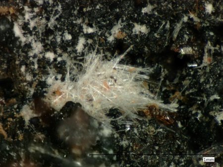 Weiße Nadeln, entweder Moraesit oder der seltene Brandaoit. Kann nur durch eine Analyse bestimmt werden.. |