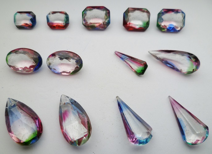 Unterscheiden kann man beide dadurch, daß man die Bedampfung vom Bergkristall abkratzen kann, beim Pressglas dringen die farblichen Metalloxide jedoch in den Stein ein und sind nicht entfernbar.