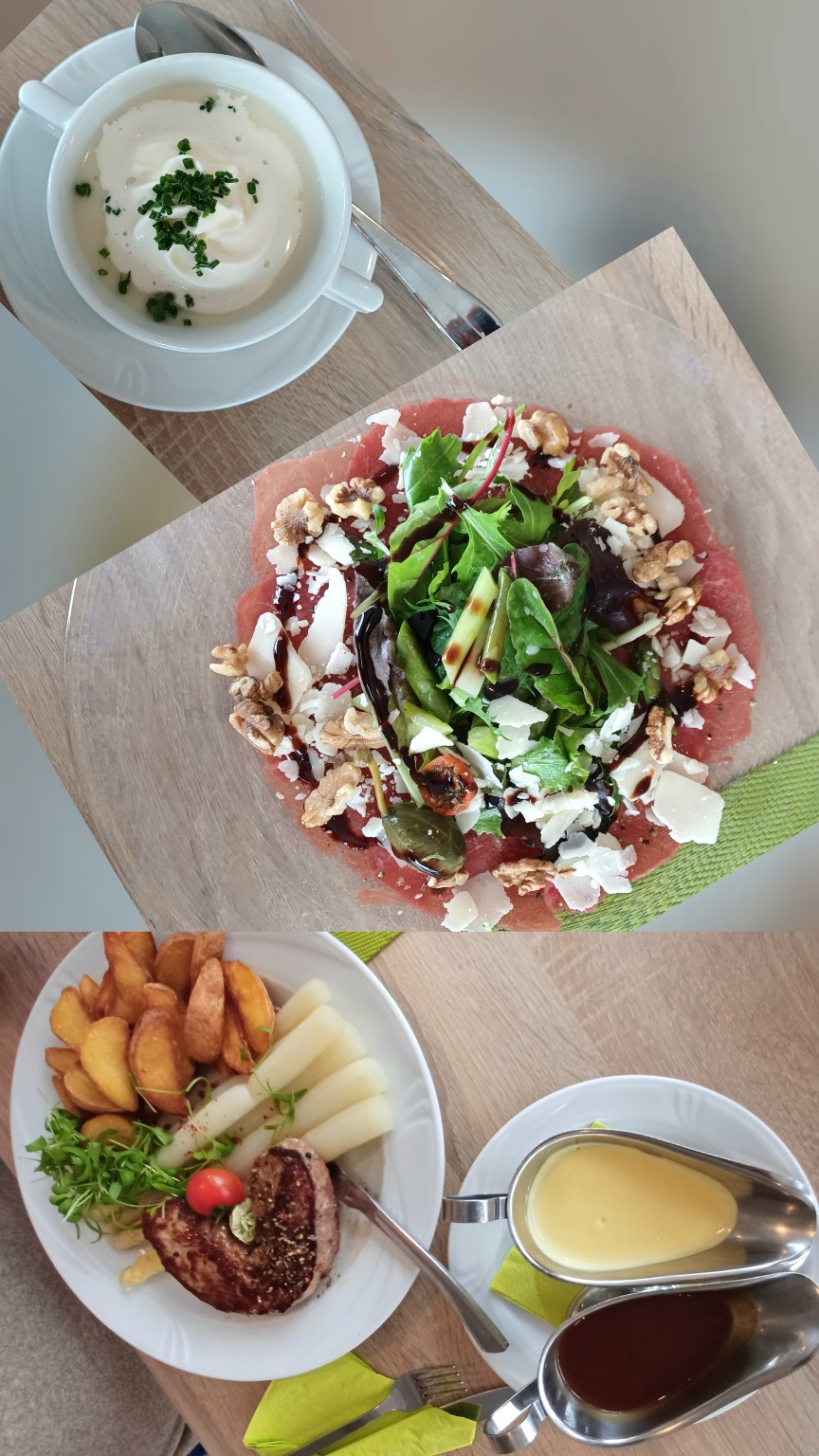 Ich hab sie eingeläutet mit einer Spargelcremesuppe und Rindercarpaccio mit grünem Spargel auf Wildkräutersalat mit Walnüssen, während mein Mann Spargel an Kalbshüftsteak mit Kartoffelspalten bevorzugte.
