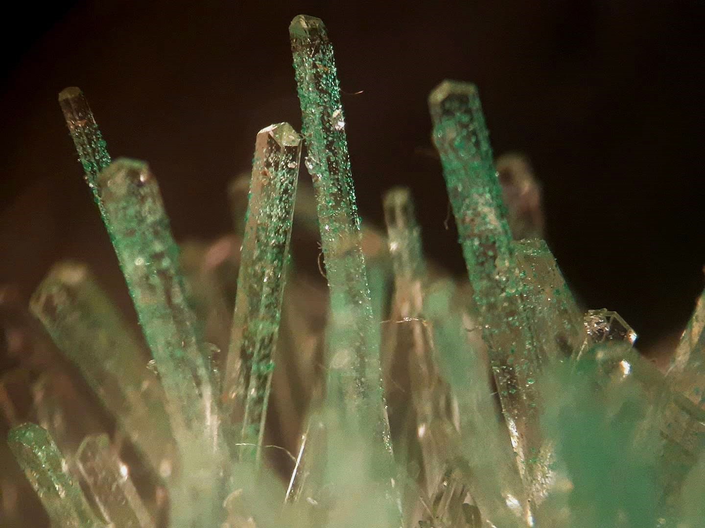 Gipse aus Lubin in Polen sieht man ja immer wieder mal in Sammlungen. Manche sind durch Einschlüsse eines Kupferminerals grün gefärbt. So ein Stück hab ich auch. Das hab ich jetzt auch mal unterm Bino betrachtet. Das