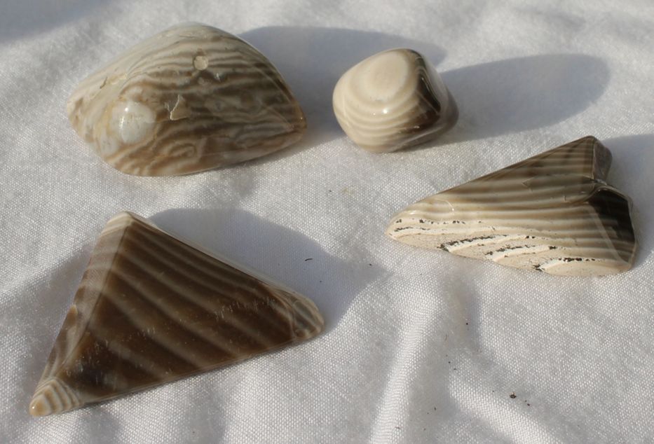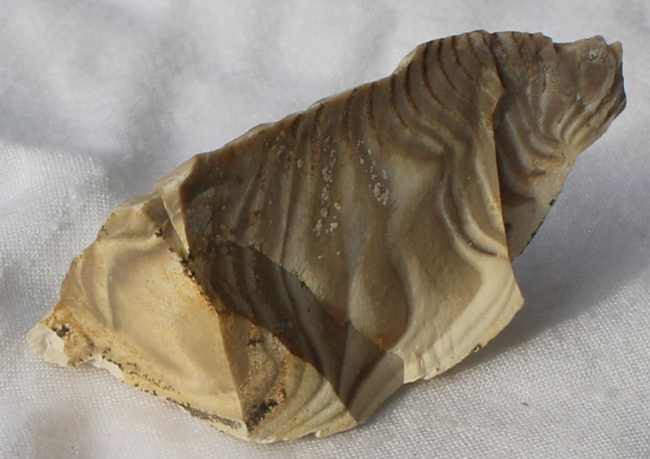 Wenn man einem Flintstück einen Hammerschlag versetzt, bricht es in scharfkantige Scherben. Die Spaltflächen weisen dann einen sog. "muscheligen" Bruch auf. (sieht dann eben einer Muschel ähnlich)!
