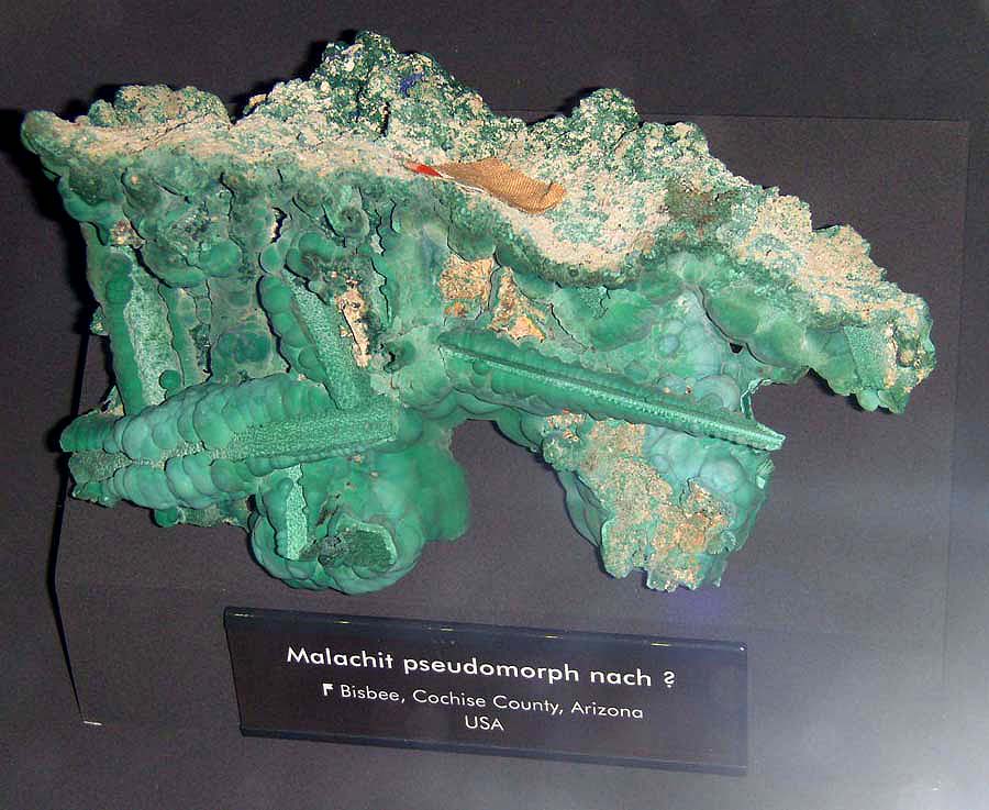 Bisbee, Arizona steht für einen Grubenort nahe der Südgrenze von Arizona, USA. Hier liegt eine imprägnative Kupfervererzung von einem Granodiorit aus vor, die in Marmorzonen reicher und kompakter wird. Die Primärvererzung besteht aus Chalkopyrit (Kupferkies), Enargit, Bornit, Molybdänit, Digenit und Pyrit in guten Kristallen. Die Anreicherungszone führt besonders Chalkosin (Kupferglanz). Von hier stammen z.T. hervorragend schöne Oxidationserze: Azurit, Malachit, Mangan-Erze, Cuprit, Tenorit, Delafossit, ged. Gold, Kupfer-Silikate etc.