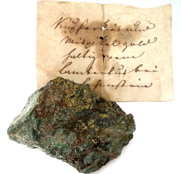 | Information: | Goldhaltiges Erz aus Chalkopyrit und Arsenopyrit. 7 cm breite, sehr alte Stufe von der Grube St. Lampertus. |