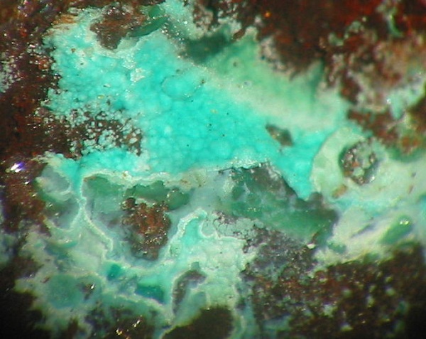 | Information: | Bläuliche Aggregate aus Parnauit und Lavendulan, vergesellschaftet mit grünen Chalkophyllit-Täfelchen. |