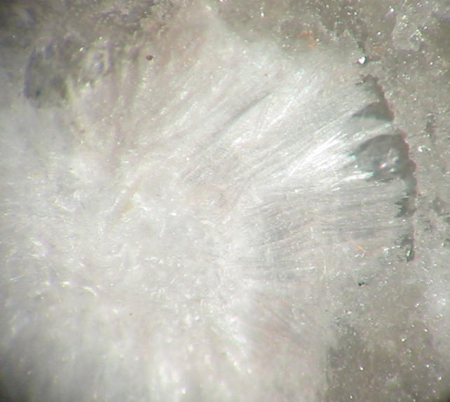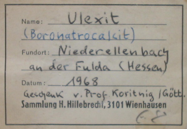 Dieser hübsche Ulexit von Niederellenbach stammt aus den ersten dortigen Funden (die ersten in Deutschland) und wurde vom bekannten Göttinger Professor Sigmund Koritnig gesammelt. Ich weiß nicht, wie es in Hessen aussieht, aber zumindest nach meiner Wahrnehmung ist von dieser einstigen "mineralogischen Massenware" kaum mehr etwas zu sehen...