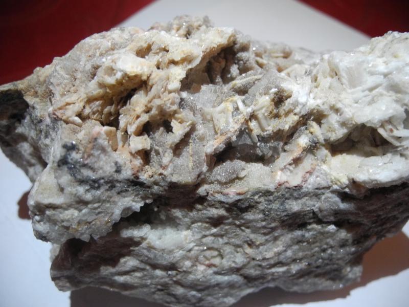 .. sieht nach Baryt (Schwerspat) aus .. ich erkenne einige dick- und auch dünnfalige xx .. aber ohne Garantie auf Richtigkeit. Fühlt sich denn die Stufe recht schwer in der Hand an? Wenn ja, ists wohl auch Baryt. Was allerdings noch darauf sein könnte und ob es auch verquarzter Baryt sein könnte, keine Ahnung.