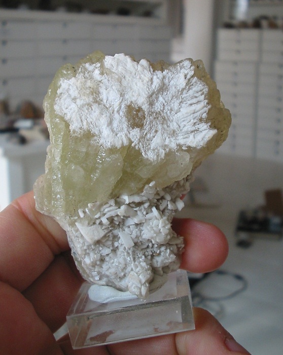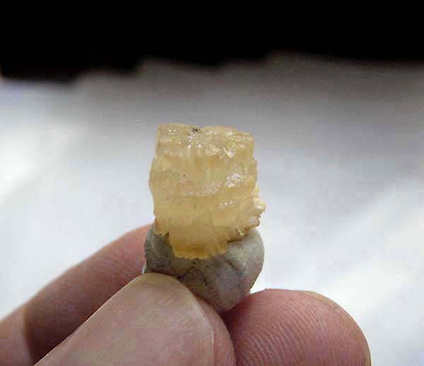 Gelbe, transparente Strontianitkristalle auf einem alten Fund auf der Grube Alwine bei Ahlen im Münsterland. Breite etwa 7,5 cm. |