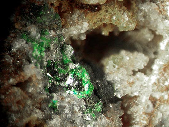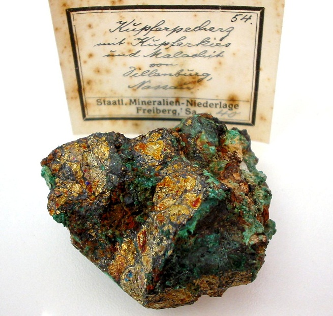 Mineralien: Malachit, Calcit, Chalkopyrit (Kupferkies), Pyrit (Schwefelkies), Quarz, Hämatit, Inesit u.a.