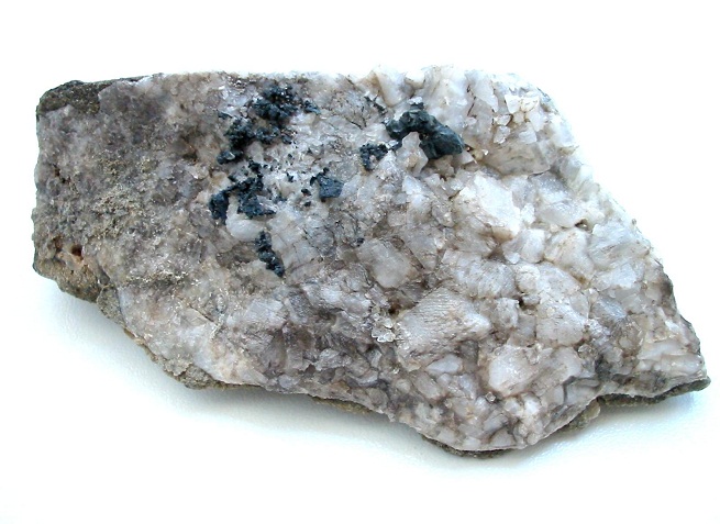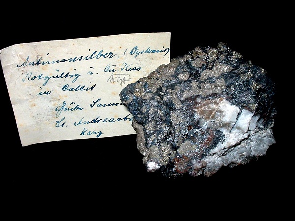 Handstück aus massivem Dyskrasit, mit Pyrargyrit und Calcit verwachsen. Von St. Andreasberg im Harz. |