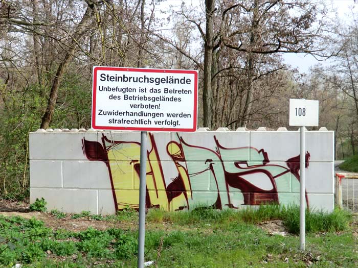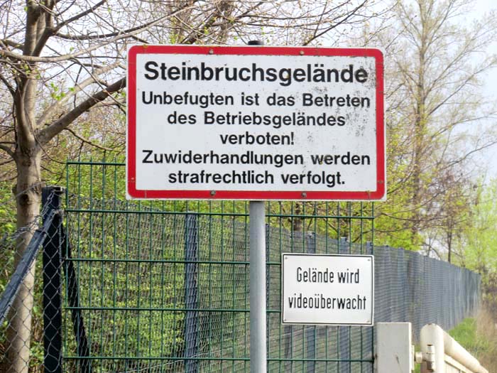 Dagegen, d.h. gegen ein "Naturreservat", sprechen allerdings meine gestrigen Beobachtungen. So fuhren ständig LKW's aus Richtung Steinbruch heraus und auch wieder hinein. Evtl. wird ja auch nur in Teilen des Steinbruchs gearbeitet (evtl. Recyling durchgeführt) und andere Teile stehen dann noch unter Naturschutz? Wie auch immer. Die zahlreichen Verbotsschilder erinnern eher an Abschirmung bei Fort Knox, von Militäranlagen der ehemaligen DDR oder einer "Area 51"