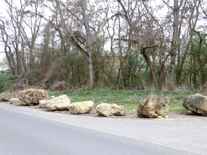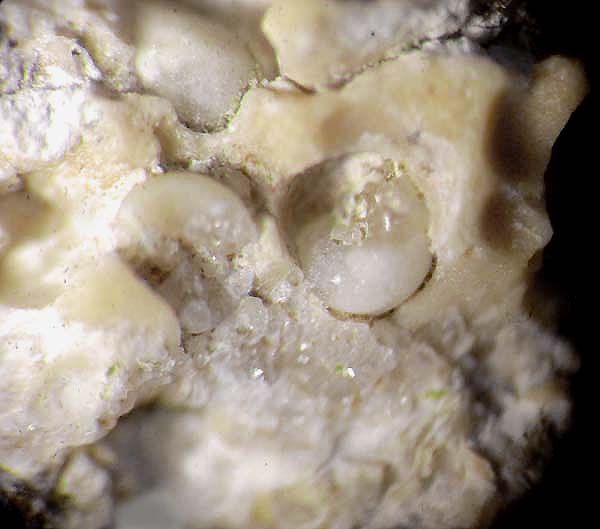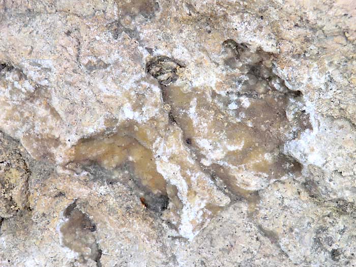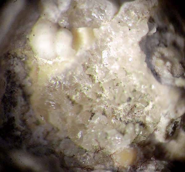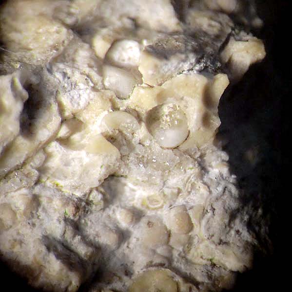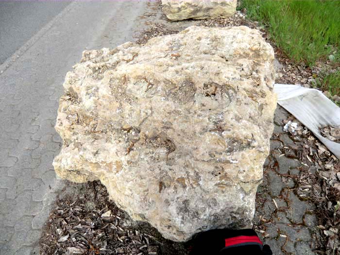 Vor dem überwachten Steinbruch-Gelände bzw. direkt am Straßenrand sind mehrere große Kalkstein-Brocken nicht zu übersehen. So schaute ich mir diese genauer an und bückte mich auch hin und wieder, um evtl. bereits abgelöste, am Boden liegende Bröckchen, zu finden. Ein Bröckchen in MM-Größe und eines in Kleinstufen-Größe waren schließlich meine "von Erfolg gekrönten Funde"! Immerhin zeigten sich dann - nach Reinigung zu Hause - unter dem Mikroskop ein paar kleine Überraschungen!
