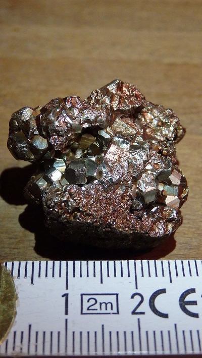 Also für mich zeigen sich auf dem Foto ganz klar die für Pyrit (Schwefelkies) typisch gedrungenen Kristalle (Pyritoeder bzw. auch vermutl. Pentagondodekaeder)! Pyrit kann auch manchmal bunte Anlauffarben zeigen, die dann durch dünnste Oxidationshäutchen verursacht werden. Verwitterungsprozesse können Pyrit auch manchmal relativ dunkel erscheinen lassen. Die für Pyrit typische Streifung auf den Kristallflächen erkenne ich auch.