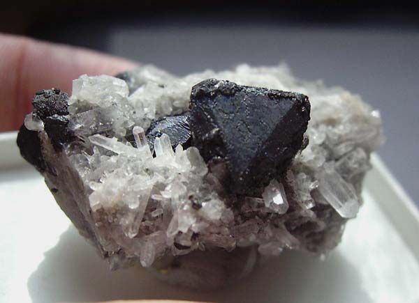 Knapp 1 cm große, glänzende Tetraedrite mit Quarz und Siderit von der Grube Altenberg bei Müsen im Siegerland. |