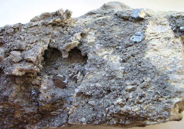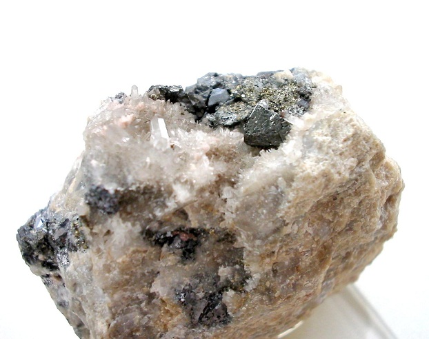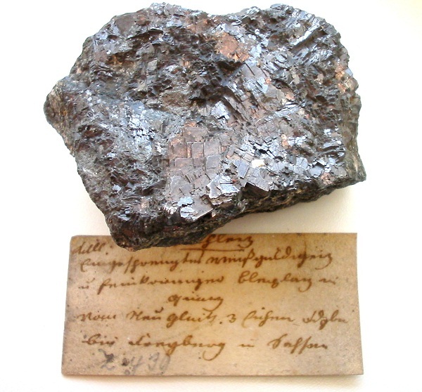 Freibergit mit Galenit, Sphalerit, Quarz und Nebengestein als "Kokardenerz" von der Grube Alte Hoffnung Gottes, Kleinvoigtsberg, Erzgebirge. Breite ca. 9,5 cm. |