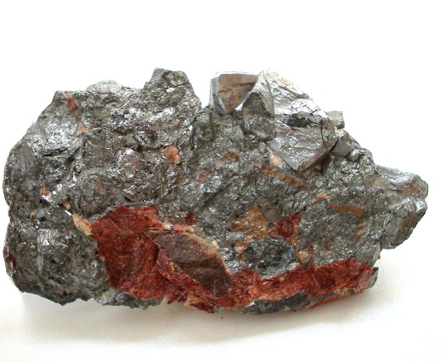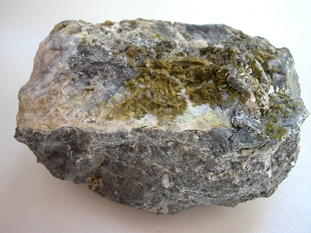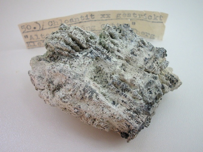 "Gestrickter" Chloanthit mit Annabergitüberzug von der Grube Alte Hoffnung Gottes, Kleinvoigtsberg bei Freiberg im Erzgebirge. Breite ca. 6 cm. |
