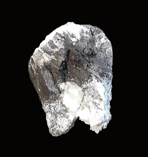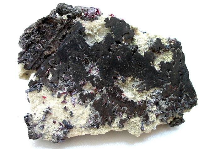 Geschnittene Platte aus gediegen Arsen mit Proustitstengeln von der Grube Vater Abraham bei Marienberg im Erzgebirge. Breite ca. 8,5 cm. |