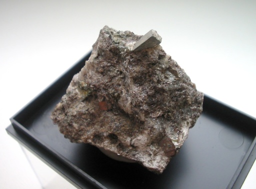 Etwa 5 cm breite Stufe mit einem 8 mm Kristall auf Quarz, Dolomit u.a. Untertagefund von 1908 auf dem Abrahamschacht, Freiberg im Erzgebirge. |
