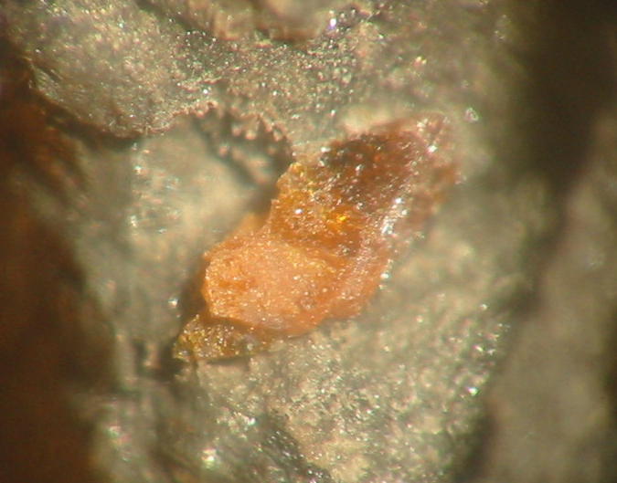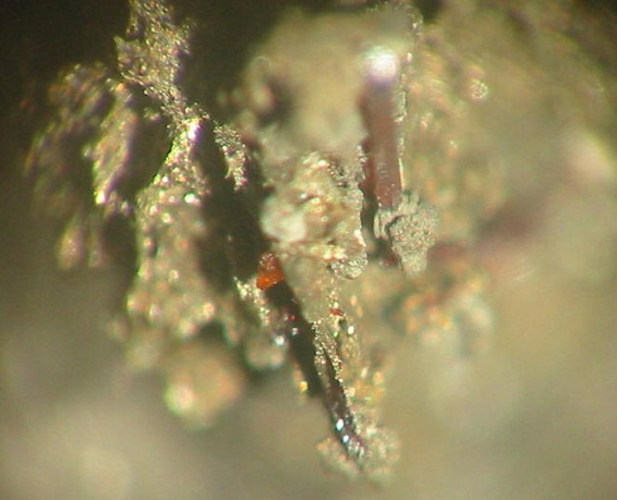 Gut ausgebildeter, aber winziger Kristall mit Proustit von der Grube Sauberg bei Ehrenfriedersdorf im Erzgebirge. |
