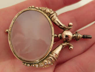 Ich habe hier vorliegend einen goldenen Prunktaschenuhrenschlüssel aus der Zeit um ca. 1780 mit Füllhörnern und einem weißem Stein. Bei der Bestimmung des Steines bin ich leider absolut überfragt und auf eure Hilfe angewiesen!