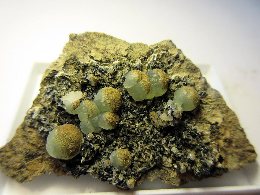 Etwa 9 cm breite Stufe von der Rauschermühle bei Niederkirchen in der Pfalz. Begleiter sind Calcit und Pektolith. |