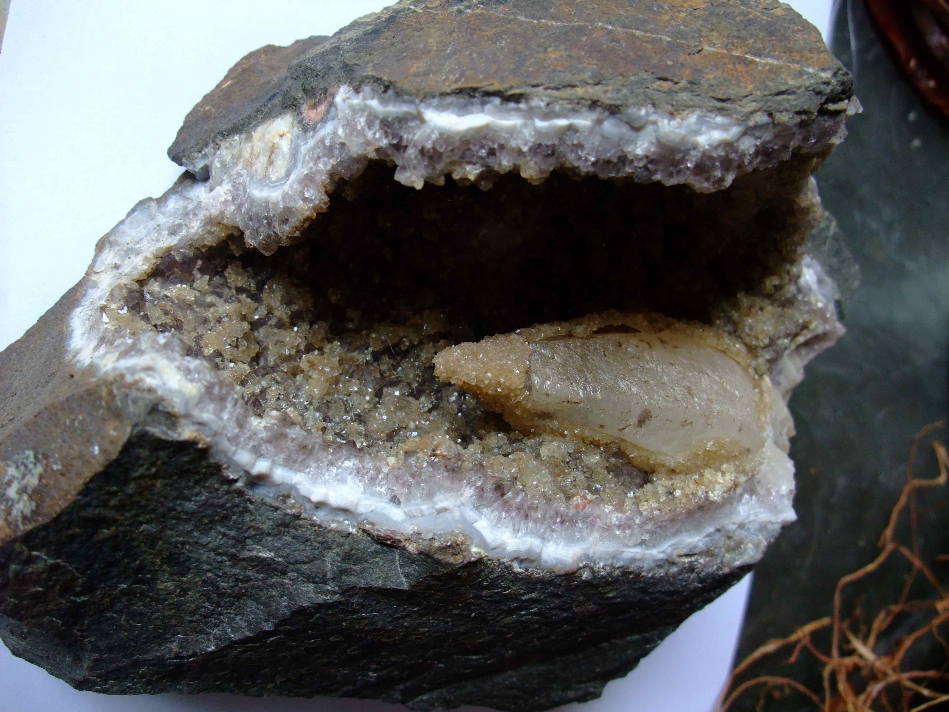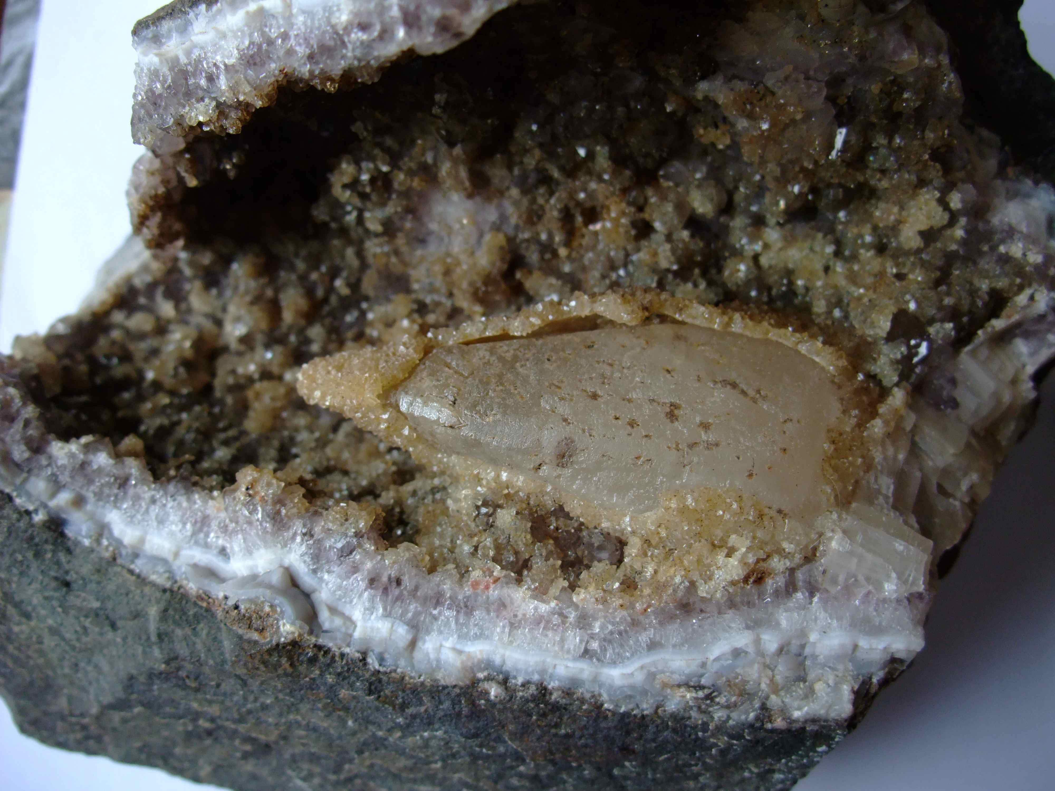 Es scheint sich um eine Druse mit Amethyst und einem gelblichen Gestein zu handeln. In der Druse selbst befindet sich ein größerer "zahnartiger Einschluss", der seinerseits zum Teil mit einer Schicht kleiner Kristalle überzogen ist.