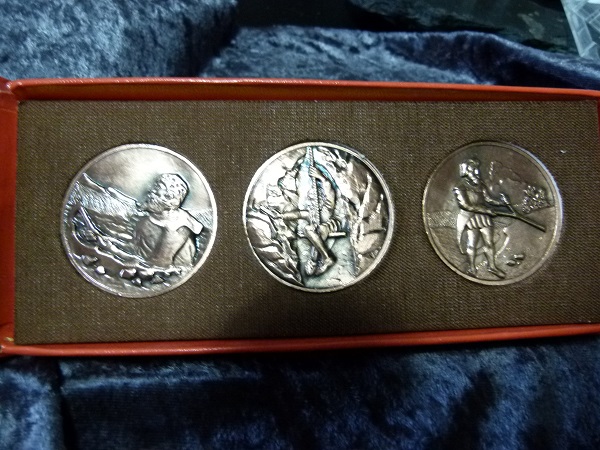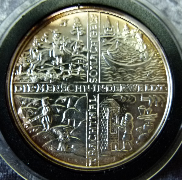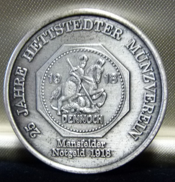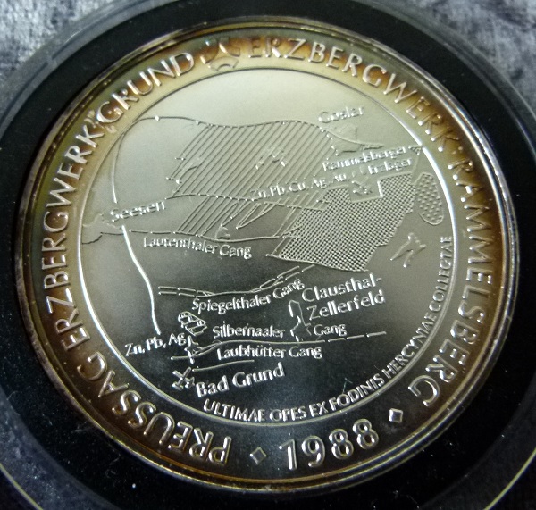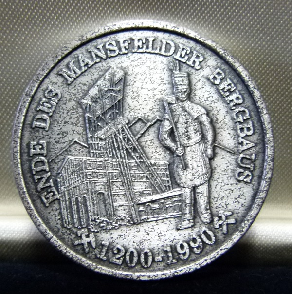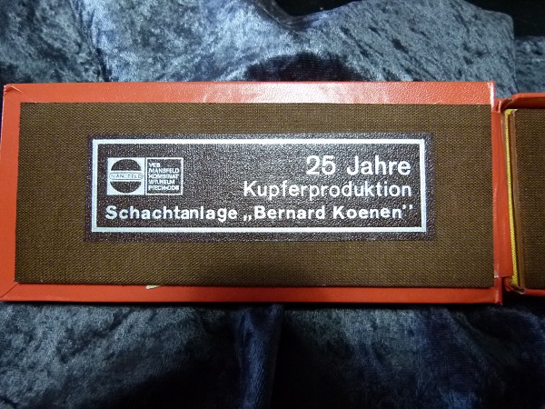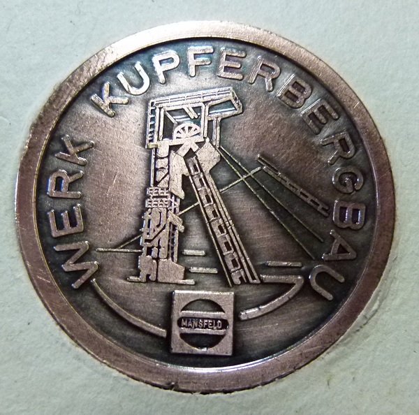 neben den Mineralien fallen mir auch gelegentlich Medaillen in die Hand, welche Ereignisse des Bergbaues zum Anlass haben. So zum Beispiel eine Prägung welche zum 25. Jubiläum des Hettstedter Münzvereins geprägt wurde und als Thema das Ende des Mansfelder Bergbaues aufgreift. Auch eine weitere Medaille der PREUSSAG von 1988 hat das Ende des Bergbaues, nämlich den des Bergbaues am Rammelsberg im Oberharz zum Thema. Das wird auch durch die Inschrift „ultimae opes ex fodinis hercynae collectae“ zum Ausdruck gebracht. Zu beiden Medaillen habe ich keine Informationen bezüglich der geprägten Stückzahl. Auch interessant ist ein Satz von drei Kupfer- Medaillen die zum 25. Jahrestag der Schachtanlage „Bernard Koenen“ (wohl Schacht „Bernard Koenen I“) bei Sangerhausen zusammengestellt wurde. Die drei Motivmedaillen wurden sicherlich in größerer Stückzahl geprägt und zu gewissen Anlässen ausgegeben.