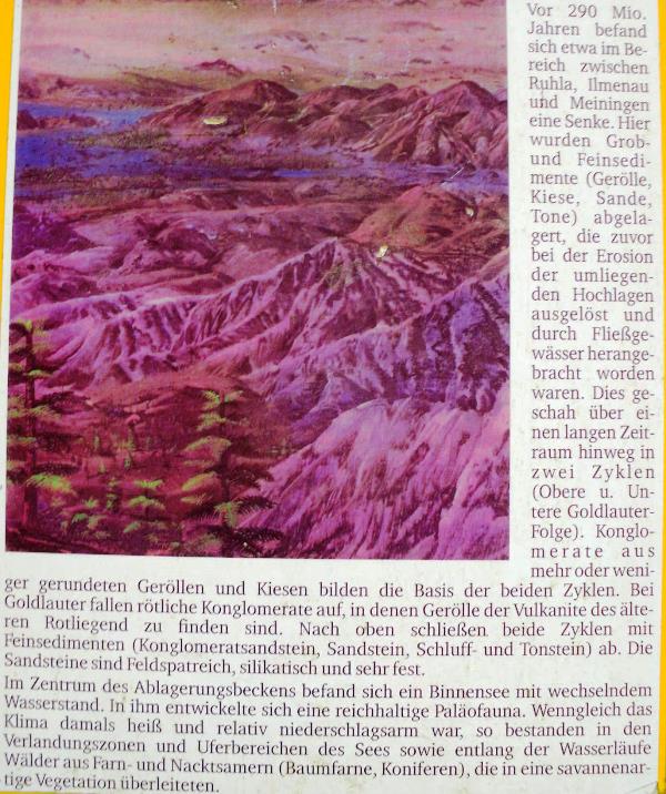 Vor etwa 290 Millionen Jahren gab es hier eine riesige Senke. Sie reichte bis nach Ilmenau und auch noch weit nach Westen. Hier bildete sich ein riesiger Binnensee mit einer bunten Flora und Fauna. Durch schwankenden Wasserstand setzten sich auf dem Grund des Sees tote Flora- und Faunabestandteile und Faulschlamm ab. Auf Grund der kontinuierlichen Ablagerungen dieser Sedimente kam es zu einer art ringförmigen Ablagerung von Mineralien, welche im Uferbereich immer wieder durch Einschwemmung von Geröll, Sand, Kies und Ton unterbrochen wurde. In seinem Zentrum wurde so Blei und Zink reicher gebildet, während sich am Randbereich eine mehr Kupfer und Arsen betonte Mineralisation ausbildete, ähnlich dem Kupferschiefer.