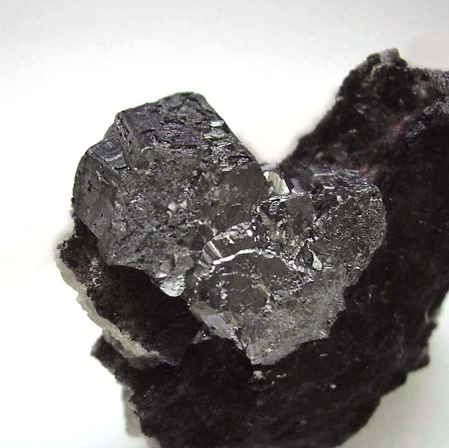 Foto zeigt hervorragende sächsische Stephanit-Kristalle auf dunkelviolettem Fluorit aus meiner Sammlung