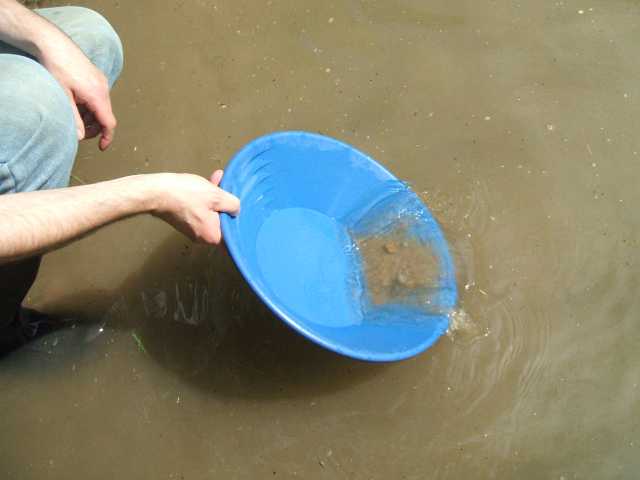 Der Waschvorgang zur Gewinnung von Goldflittern in der Waschpfanne