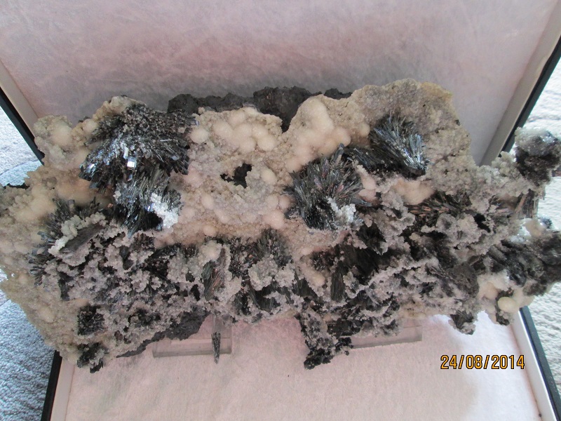 Hatte schon vor Jahren einige Mineralien gekauft und beim Transport sind die Karten dazu abhanden gekommen. Die dunklen Nadeln haben einen Bleiglanz bis je nach Lichteinfall wie Buntmetall. Der Grund sieht aus wie Bergkristall. Rückwand sieht metallisch aus, bröckelig, hinterläßt graue Spuren an den Händen.
