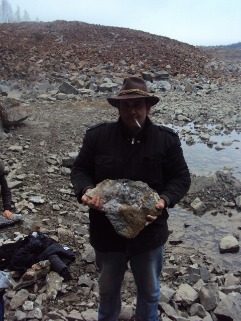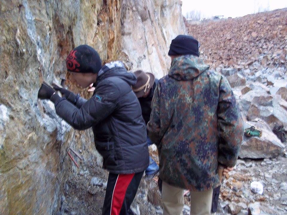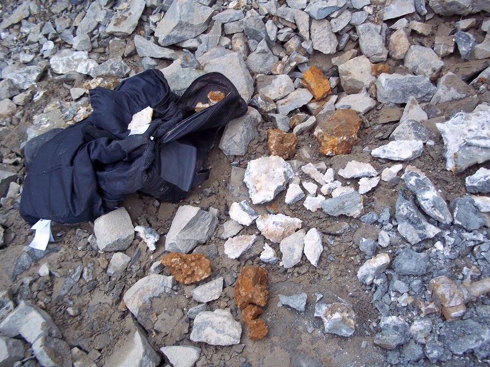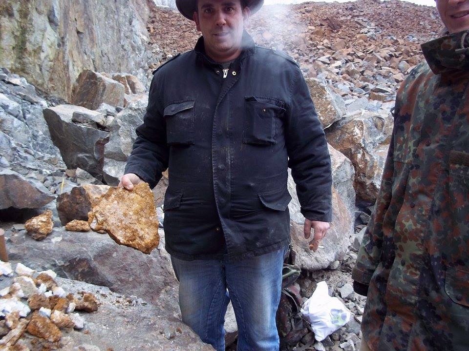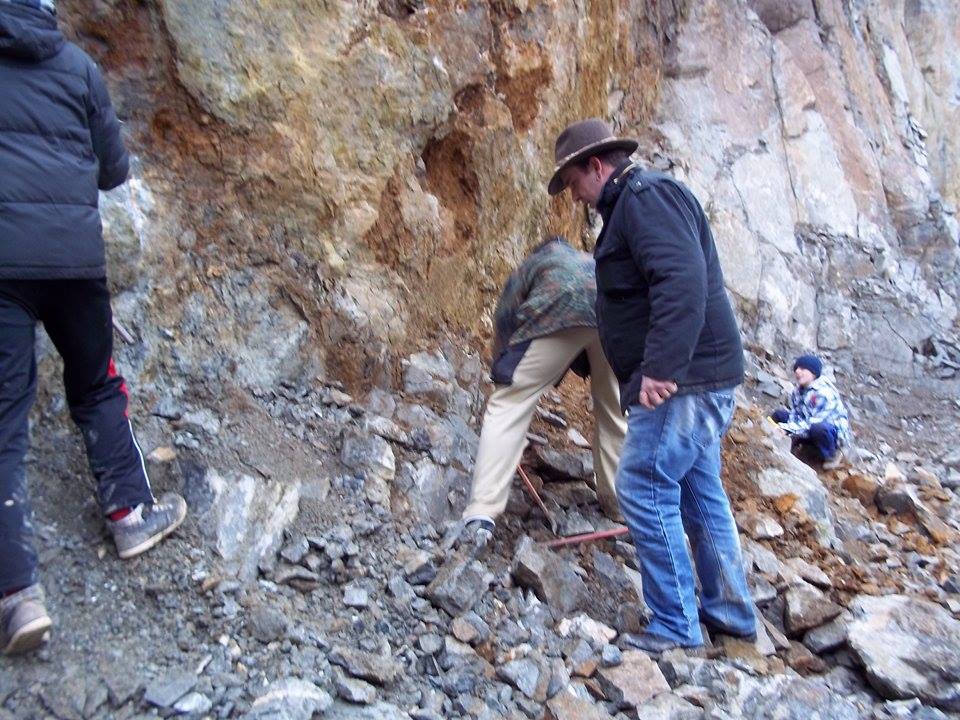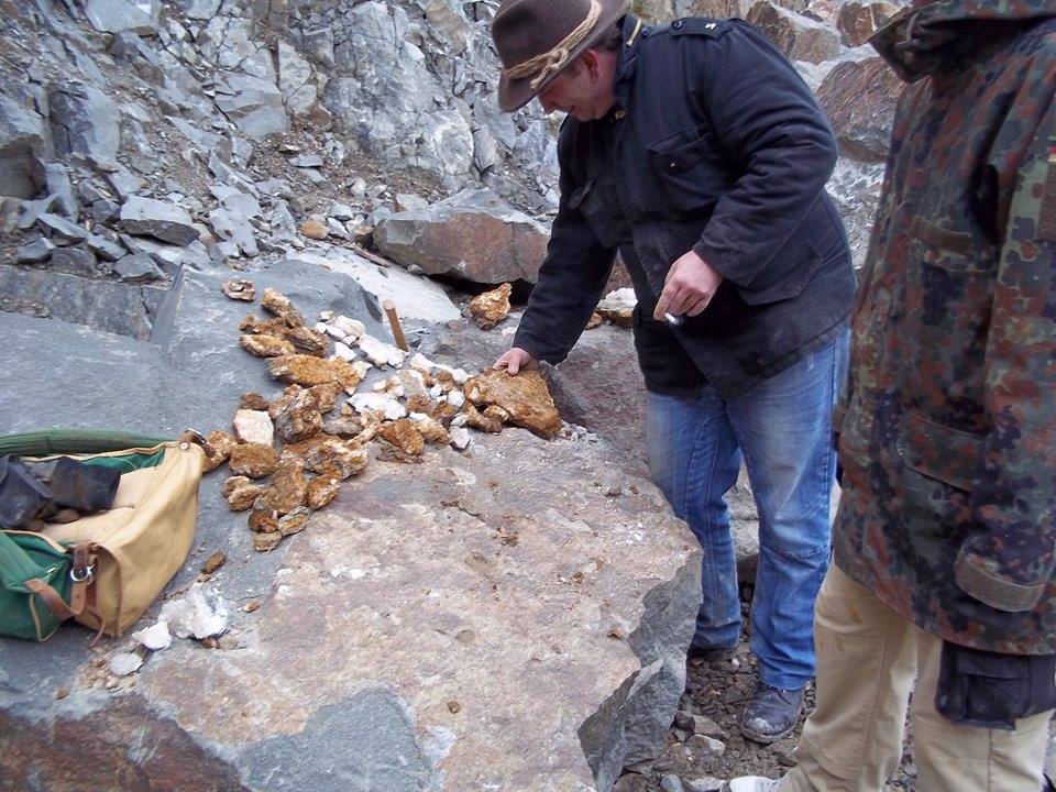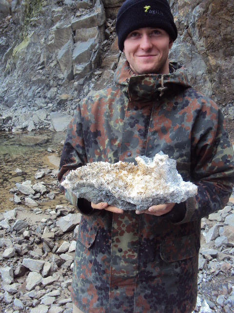 als wir da seine Ausbeute sahen.Kurze Rauchpause Tauschwaren verstaut und ab gings Richtung Bruch.Dort angekommen wurde das Equipment geschultert und ab ins Vergnügen.An besagter Stelle angekommen staunten Wir schon net schlecht was uns da entgegenstrahlte.Verwitterte Calcite on Mass,und dann gings mal los.Da Christians Kinder dabei waren und er zu mir sagte da klingts Hohl Stefan mach das mal frei seine kinder aber auch wollten gab ich der Jugend und Sammler von Morgen mal den Vortritt.Das was dann rauskam muss man gesehen haben.Und Wir hatten das LIVE erlebt.Funde wurden danach auch sehr viel gemacht Die Druse wurde fast komplett geleert aber weil mein Knie sich wieder gemeldet hatt konnten zum schluss Dominik und Ich nimmer weiter machen.Dominik musste 3 mal laufen Ich 2 mal.Wie beim Treffen angemerkt war das nicht unser letztes treffen.