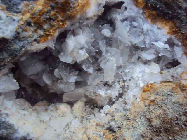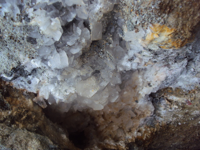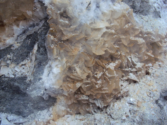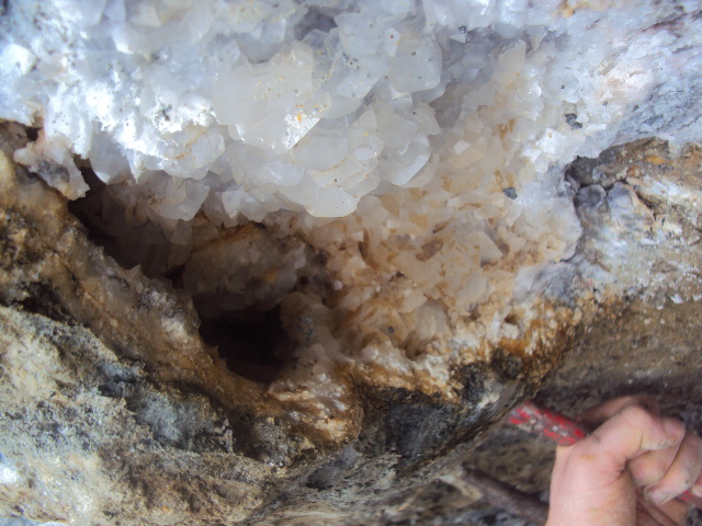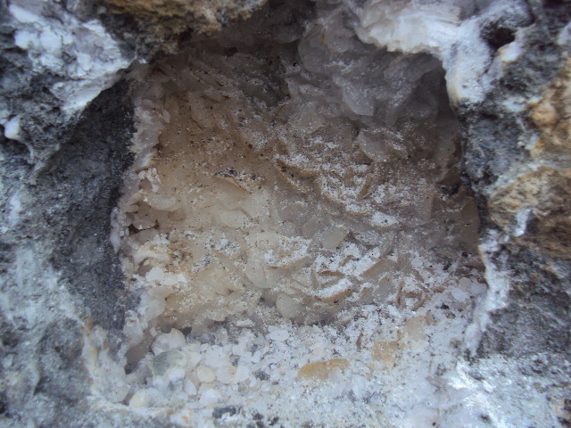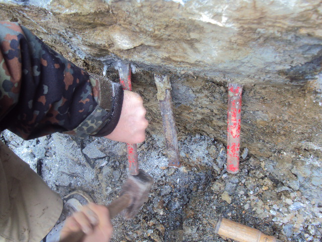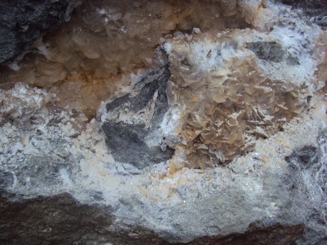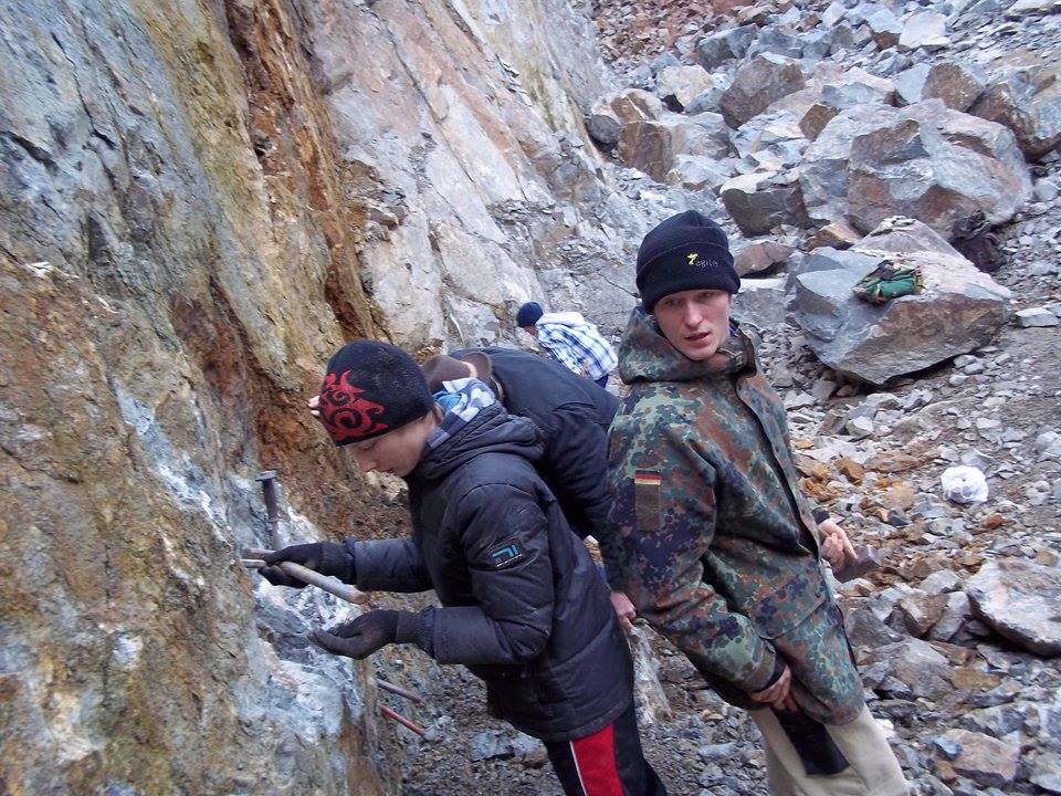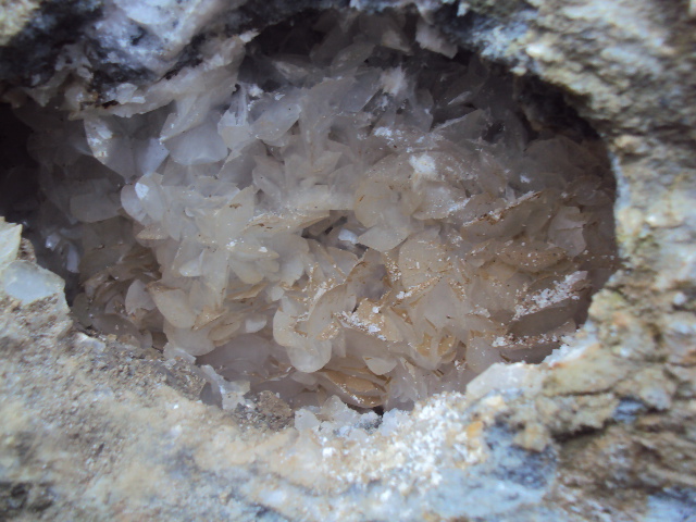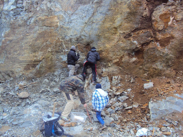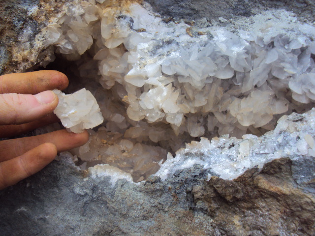 als wir da seine Ausbeute sahen.Kurze Rauchpause Tauschwaren verstaut und ab gings Richtung Bruch.Dort angekommen wurde das Equipment geschultert und ab ins Vergnügen.An besagter Stelle angekommen staunten Wir schon net schlecht was uns da entgegenstrahlte.Verwitterte Calcite on Mass,und dann gings mal los.Da Christians Kinder dabei waren und er zu mir sagte da klingts Hohl Stefan mach das mal frei seine kinder aber auch wollten gab ich der Jugend und Sammler von Morgen mal den Vortritt.Das was dann rauskam muss man gesehen haben.Und Wir hatten das LIVE erlebt.Funde wurden danach auch sehr viel gemacht Die Druse wurde fast komplett geleert aber weil mein Knie sich wieder gemeldet hatt konnten zum schluss Dominik und Ich nimmer weiter machen.Dominik musste 3 mal laufen Ich 2 mal.Wie beim Treffen angemerkt war das nicht unser letztes treffen.