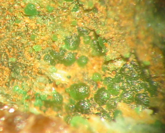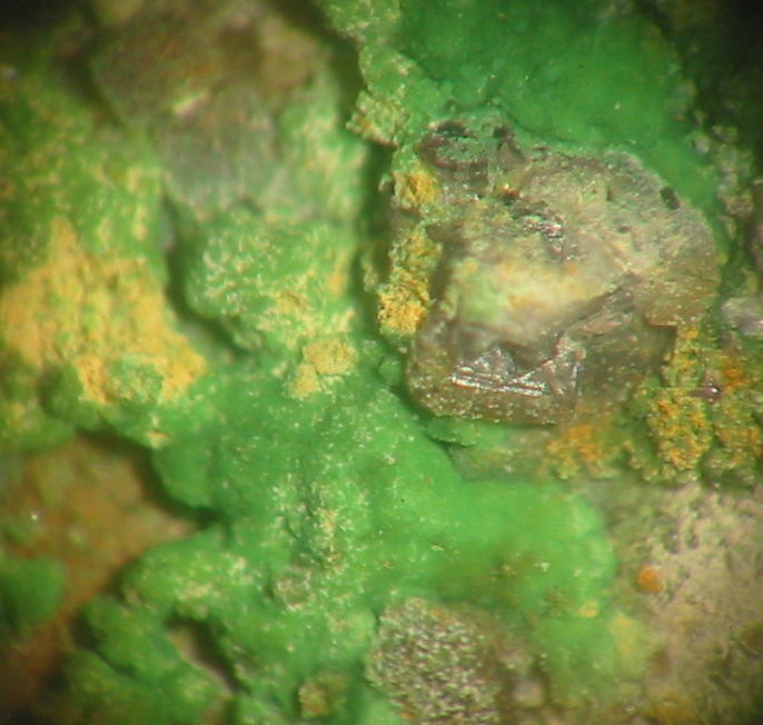 Kleinstufe - auch mit Konichalcit darauf - dieser erkennbar mit Lupe oder unter Mikroskop |