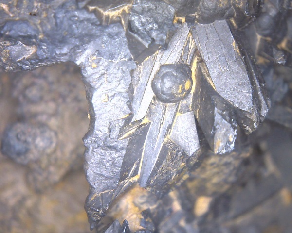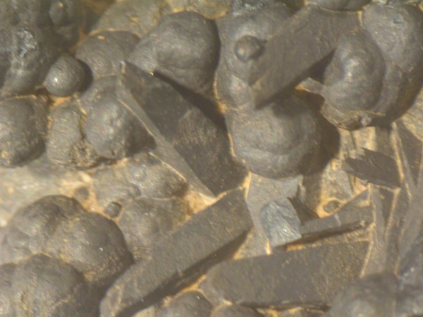 Bei dem Stück wurde ein unbekanntes Mineral durch einen Manganomelan verdrängt. Das ehemalige Mineral halten wir für Baryt ??. Auch ehemalige Pyrolusit XX möchte ich nicht ganz ausschließen. Die Kristallformen sind perfekt überliefert. Hat jemand eventuell eine Ahnung was das für ein Mineral (Kristallform) gewesen sein könnte.