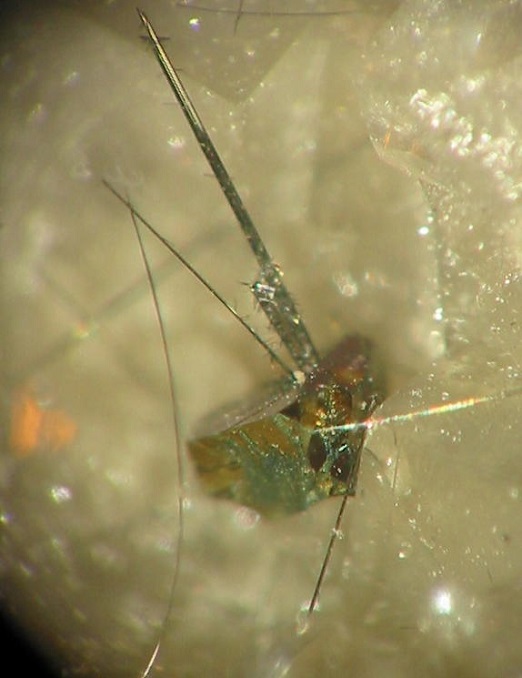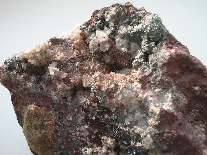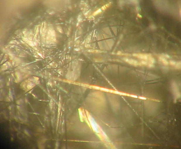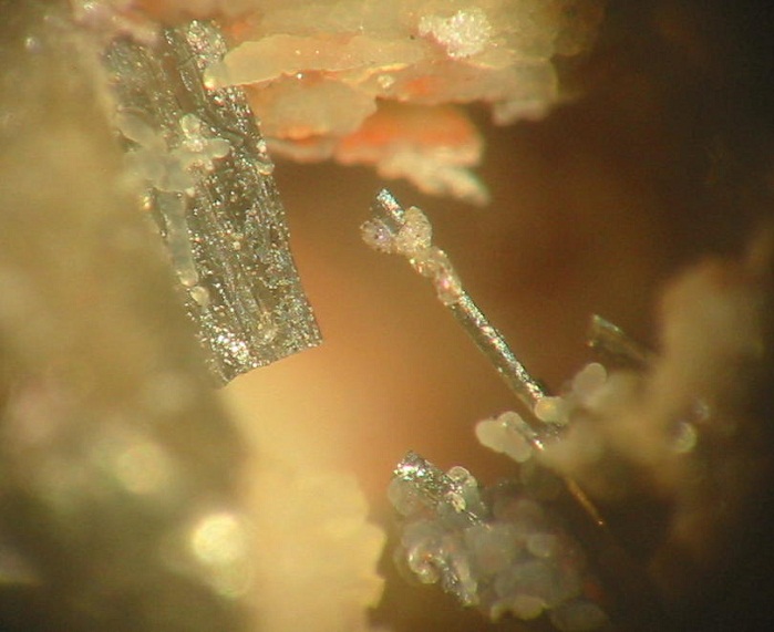 Emplektitnadeln bis 3 mm, aus einem Chalkopyrit sprossend. Fundort: Grube Käfersteige, Pforzheim, Schwarzwald. |