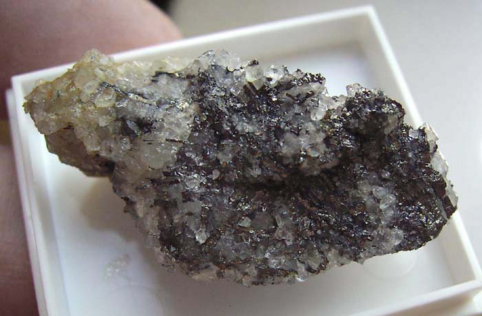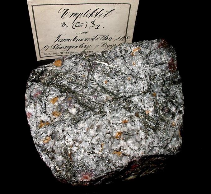 Historisches Handstück mit 5 cm langen, eingewachsenen xx vom Tannebaumstolln bei Erla im Erzgebirge. |