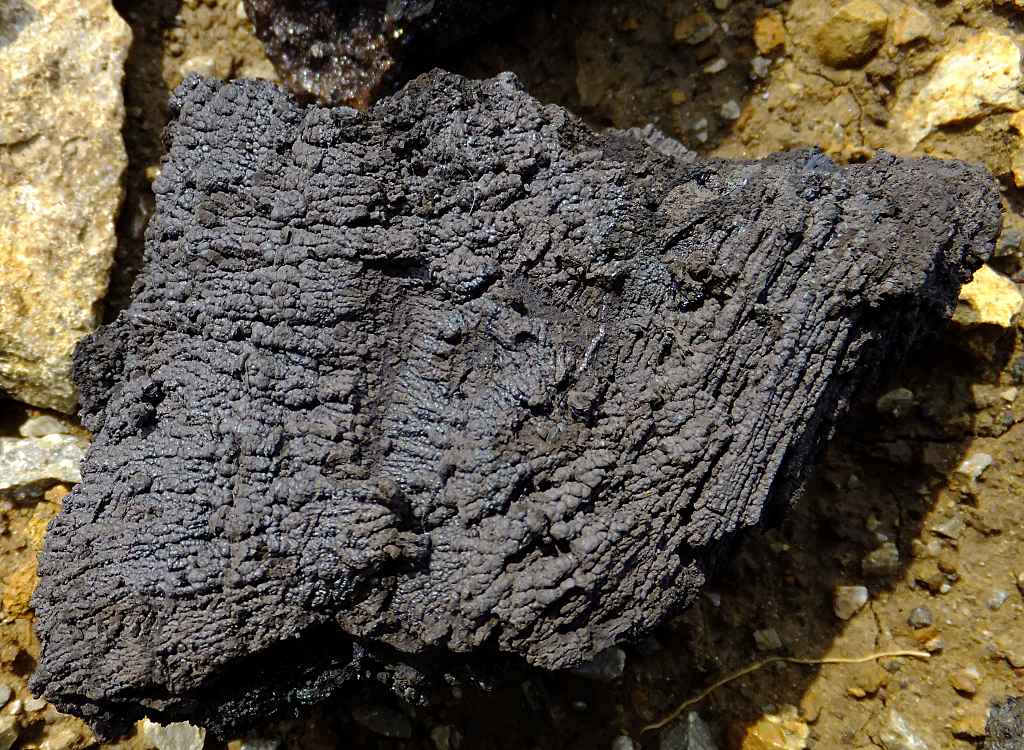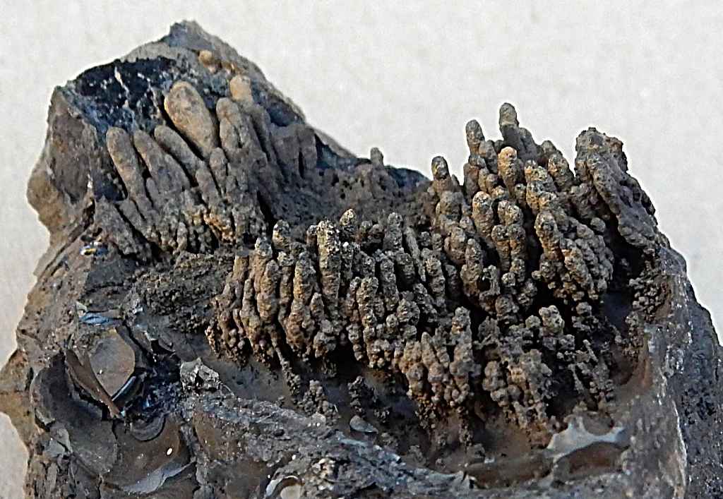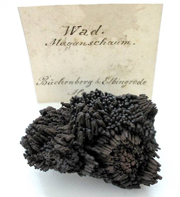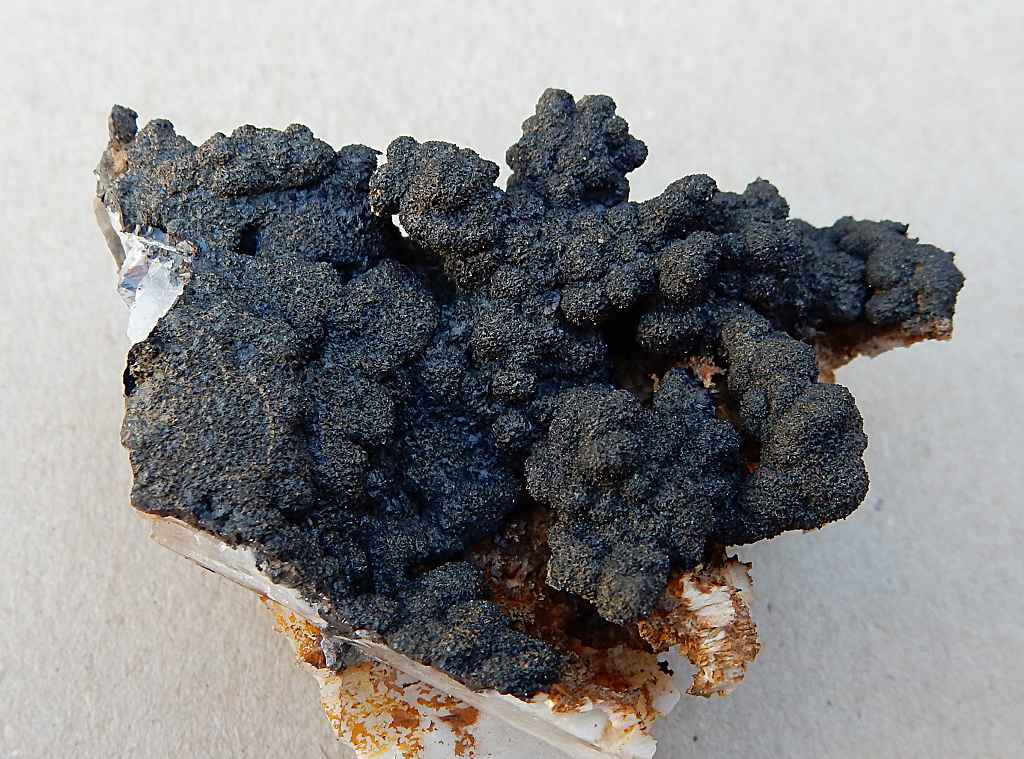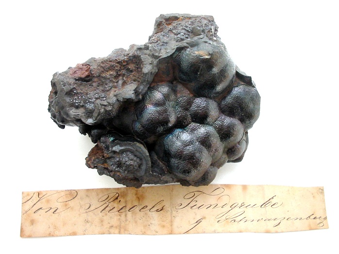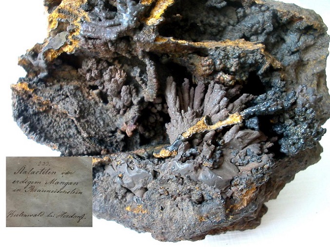 Leicht bunt angelaufen ist der Psilomelan auf dieser Stufe von der Riedel Fundgrube bei Langenberg im Erzgebirge. |
