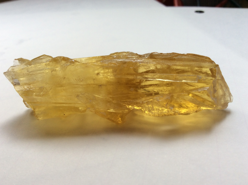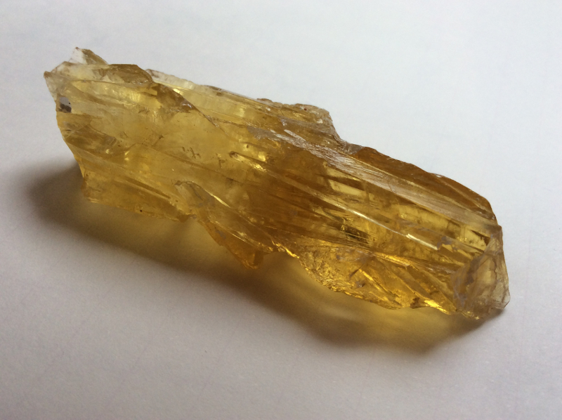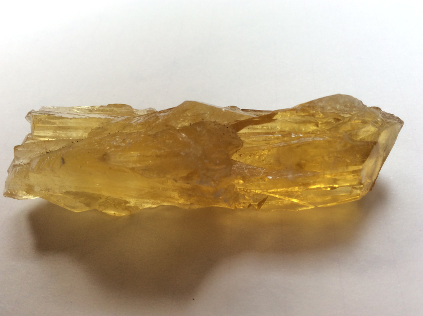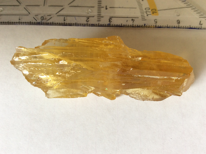 Ich habe mich auch schon etwas erkundigt und meiner Einschätzung nach könnte es eventuell Apatit sein. Das Mineral hat eine helle gelb/braune Farbe. Beim Härtetest mit einem Messer konnte ich leicht die Ecken anritzen, wobei es etwas spröde war. Vom Glanz und vom anfassen her, erinnert es mich etwas an Glas.