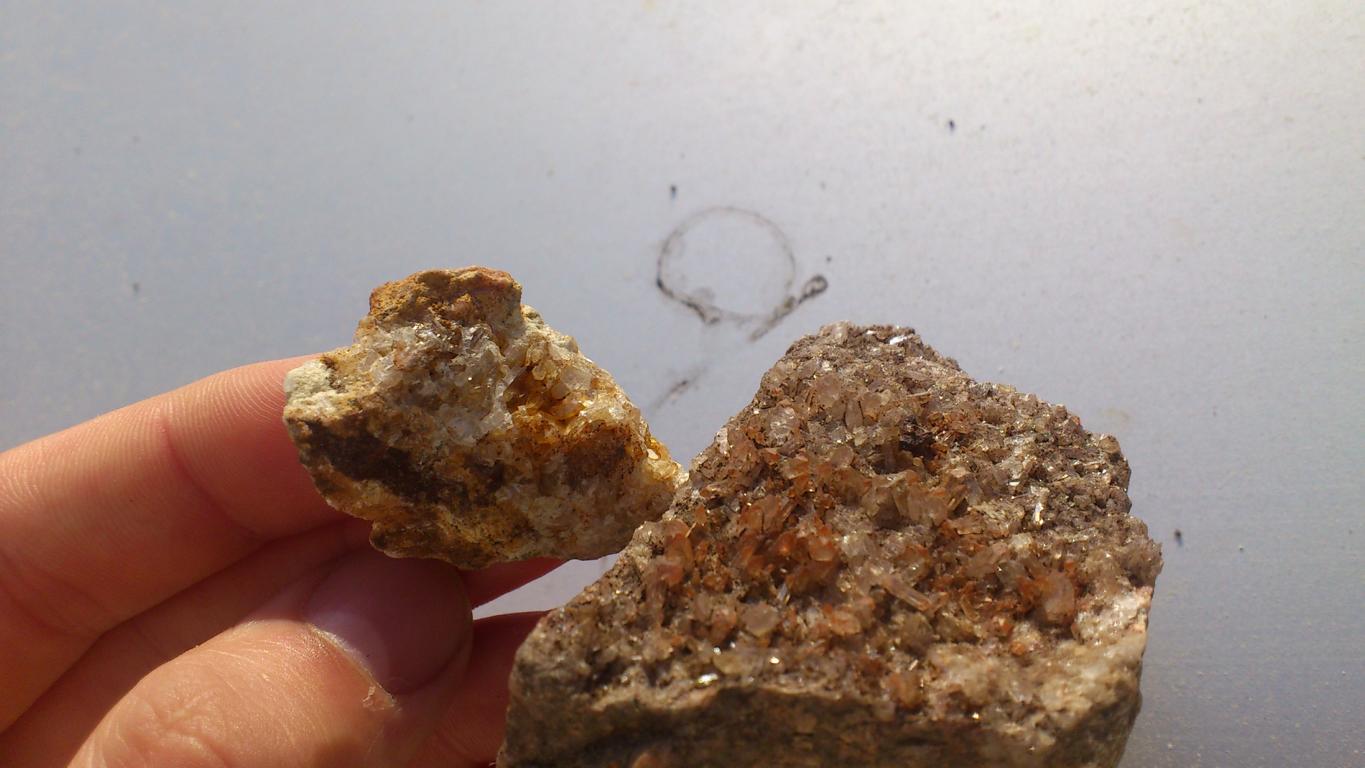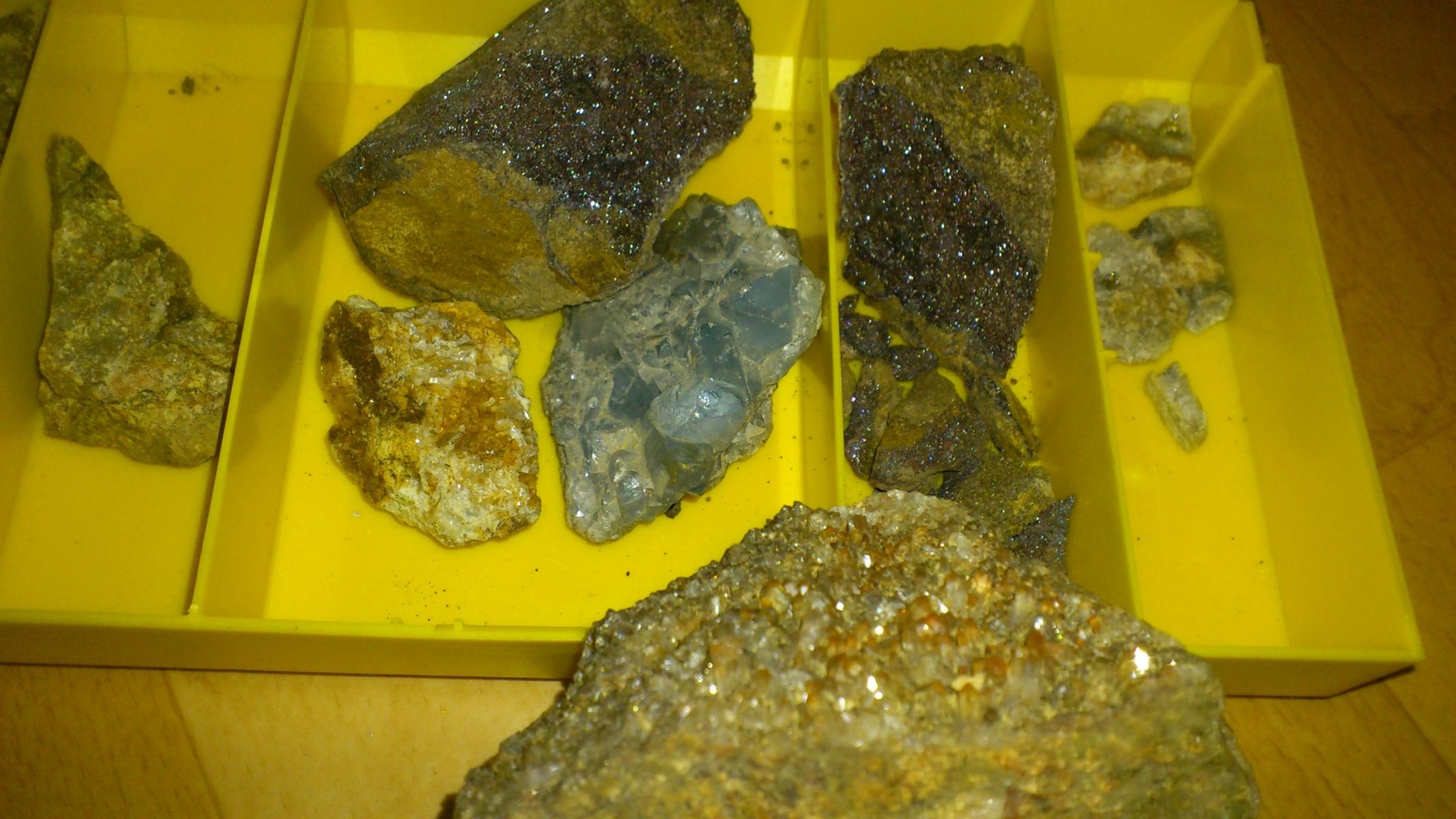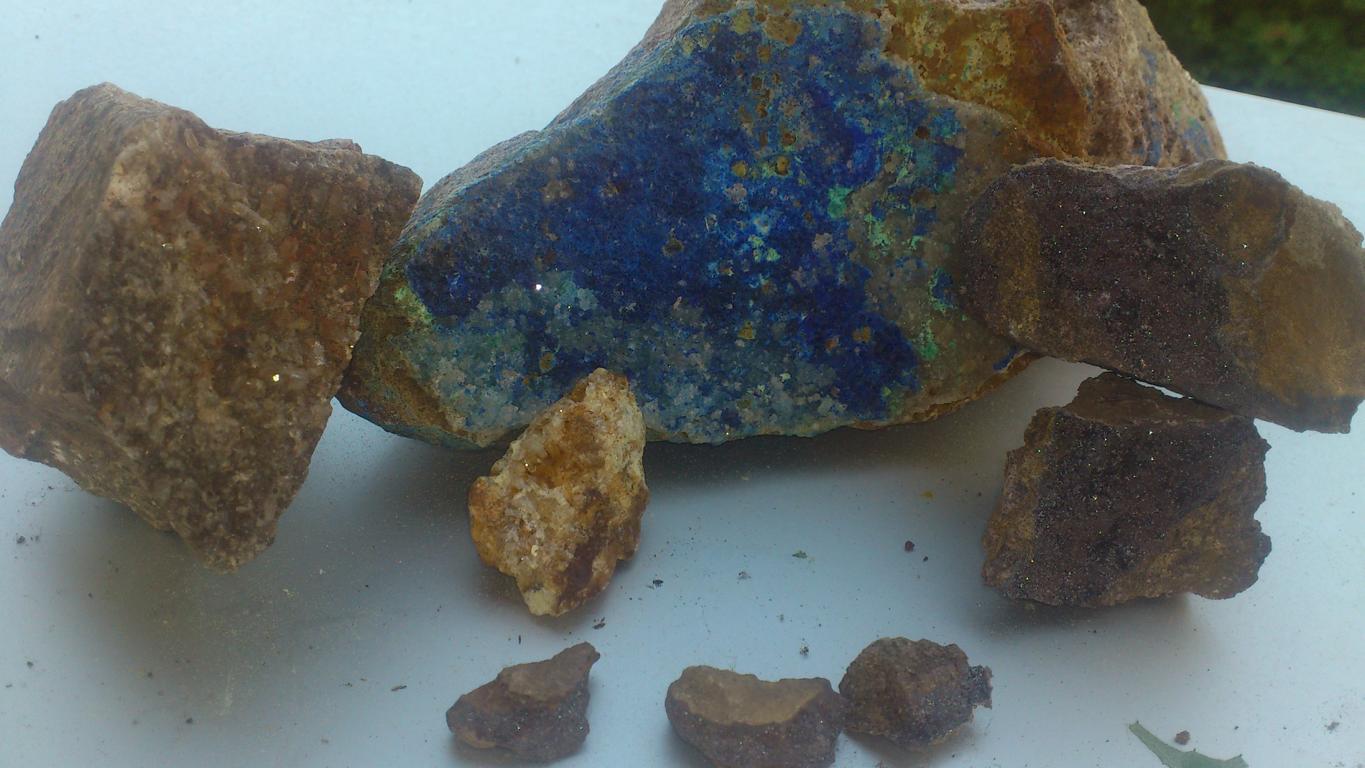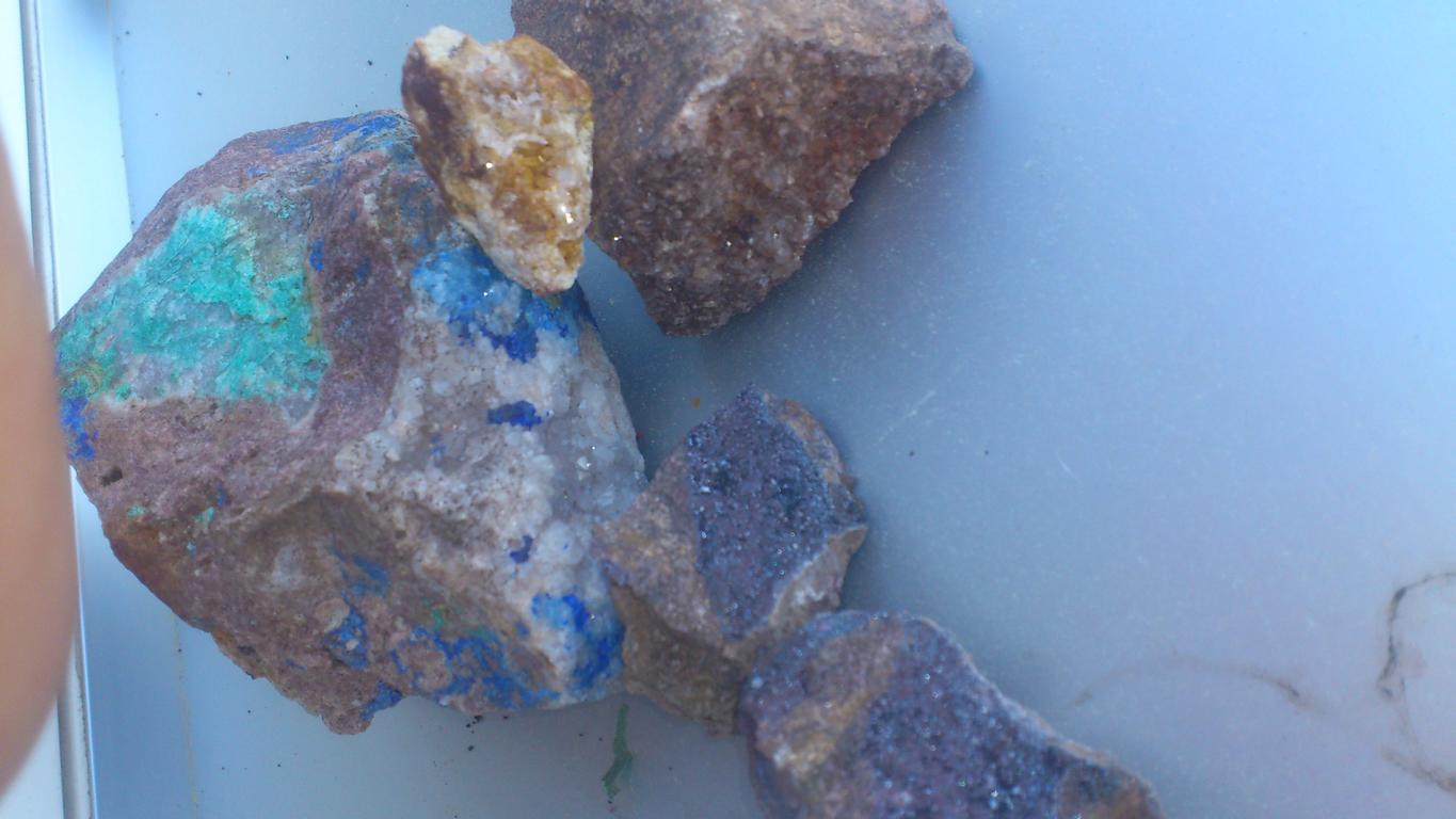 Ich beschäftige mich seit kurzem wieder mit dem Sammeln von Mineralien und konnte heute auch schon einige tolle Funde machen . Leider fehlt mir das nötige Fachwissen um die meisten Mineralien zu Bestimmen . Ich habe viele Azurite und Malachite gefunde , doch bei diesen Mineralien auf dem Bild bin ich mir unsicher , der eine Stein Glimmert sehr stark und die Finger nach dem berühren auch , der Stein daneben enthält orangene Kristalle , der im Vordergrund eher schwach braun . Den blauen hatte ich noch aus früheren Zeiten in meiner sammlung, nur weis ich ebenfalls nicht was das für einer ist. Ich wäre sehr dankbar wenn jemand etwas dazu weis.