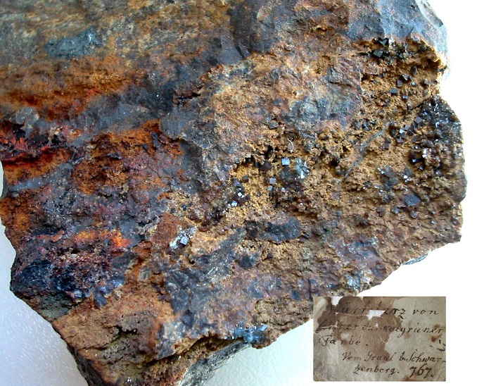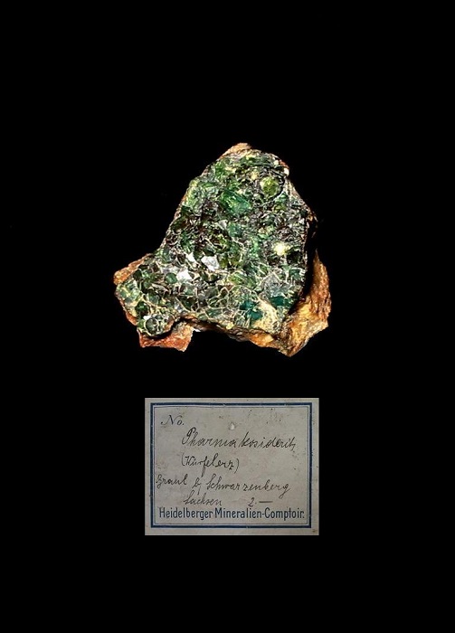 Bariopharmakosiderit xx von der Grube Stamm Asser bei Schwarzenberg im Erzgebirge. Wie auf dem Etikett zu sehen, waren die xx mal "schön dunkelgrün"... |