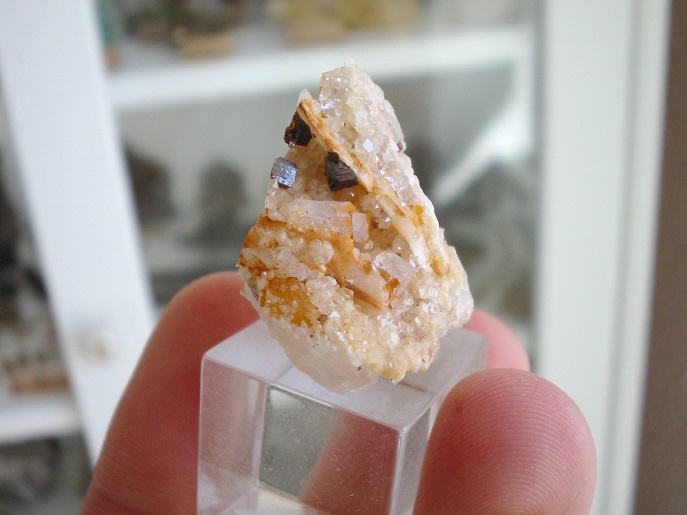 Kleines Stüfchen mit bis zu 3 mm großen Pharmakosiderit xx, die nach 100 Jahren noch immer schön blaugrün gefärbt sind. Das Stück stammt auch vom Graul bei Schwarzenberg im Erzgebirge. |
