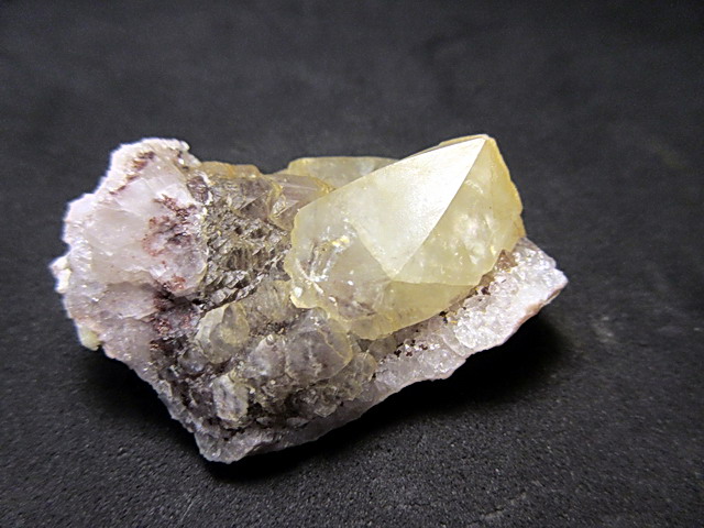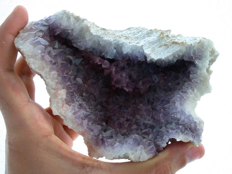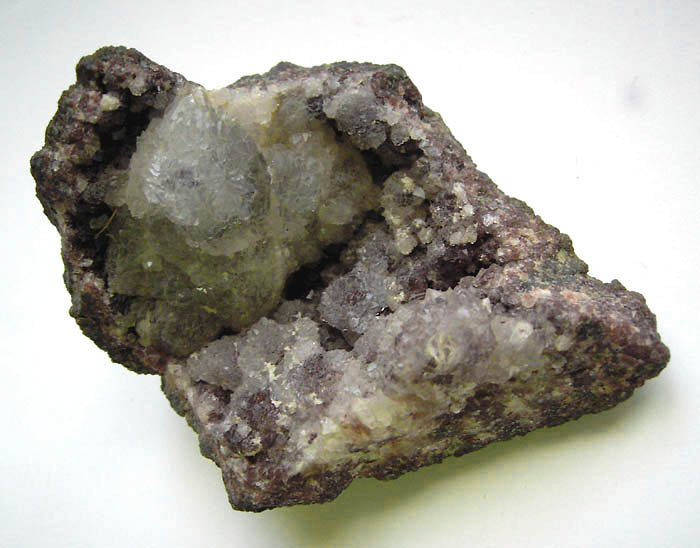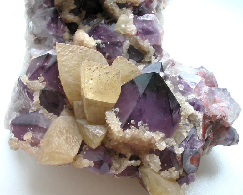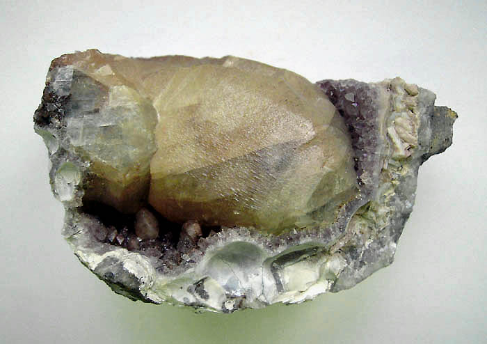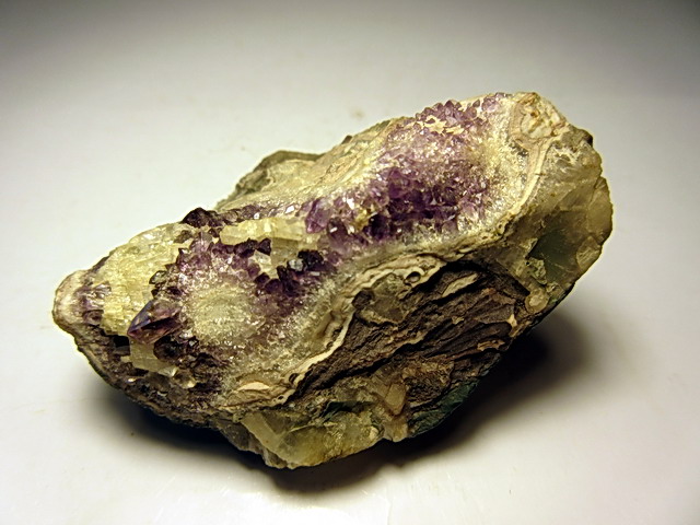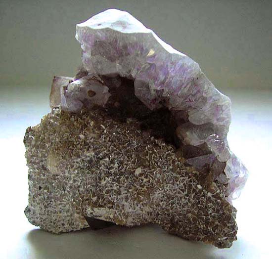 Ein Untertagefund vom Steinkaulenberg bei Idar aus den frühen 1960ern ist dieses ca. 12 cm breite Exemplar, auf dem der Amethyst mit wasserklarem Bergkristall überwachsen ist. |