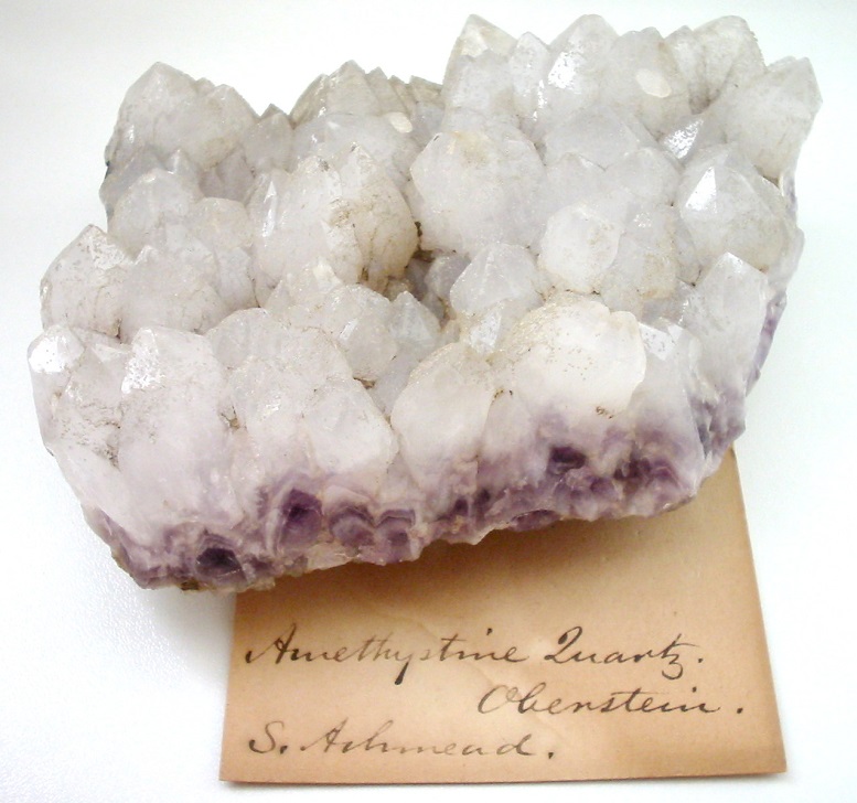 Sogenannter "Chevron-Amethyst" mit Milchquarz-Wechsellagerung. 12 cm breite Stufe von Oberstein/Nahe. Ex Samuel B. Ashmead coll./Philadelphia, USA, um 1870. |