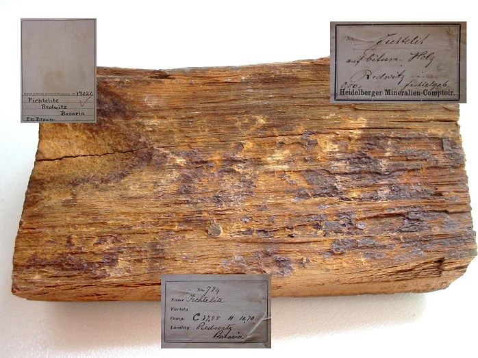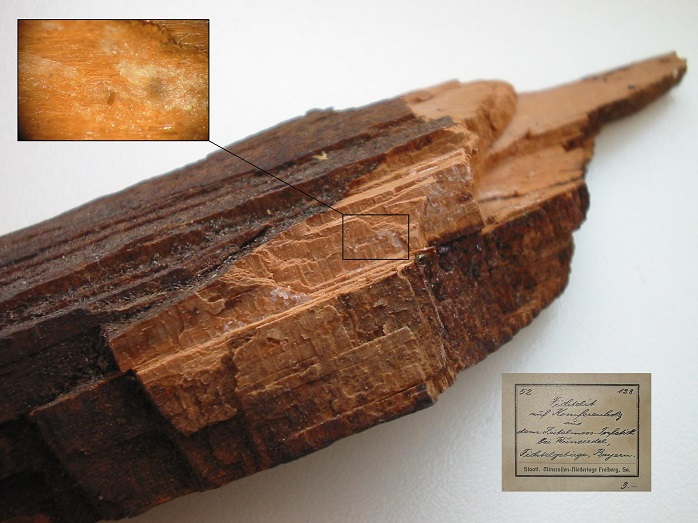 Durch Harz bräunlich gefärbte Plättchen von der Typlokalität Marktredwitz. Stufenbreite ca. 8 cm. Ex Heidelberger Mineraliencomptoir via Academy of Natural Sciences of Philadelphia. |