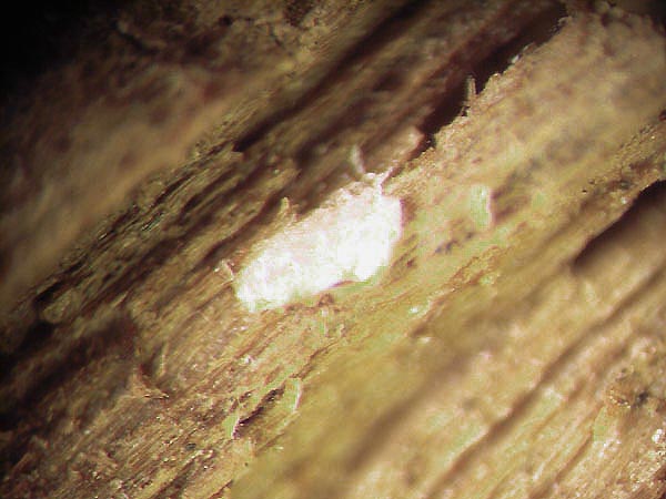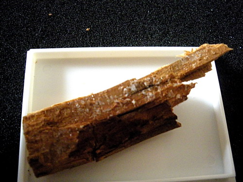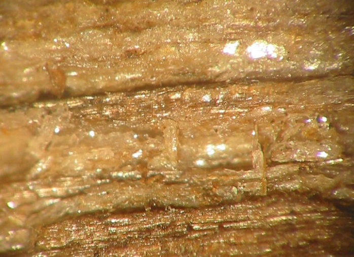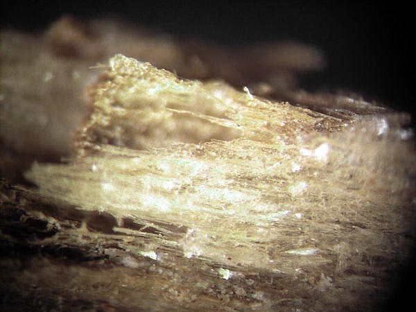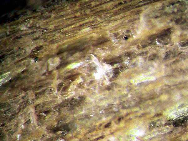 Weiße Beschläge auf etwa 9 cm breiter Stufe vom Zeitelmoos bei Wunsiedel (ex Bergakademie Freiberg). |